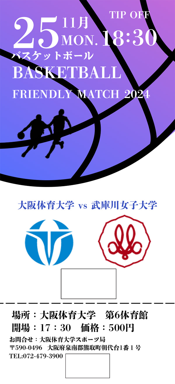 | 『フレンドリーマッチ 2024 大阪体育大学×武庫川女子大学』 [日 時] 2024年11月25日(月)18:30開始(17:30開場) [場 所] 大阪体育大学 第6体育館 3階 [対 戦] 大阪体育大学 vs 武庫川女子大学 [料 金] 500円(小学生以下無料) [主 催] 大阪体育大学 [主 管] 大阪体育大学バスケットボール部、大阪体育大学スポーツ局 [協 力] 武庫川女子大学 [運営協力] 大阪体育大学体育学部・スポーツ科学部学生 [協 賛] 株式会社エイブル、トヨタ紡織サンシャインラビッツ、紀陽銀行ハートビーツ、株式会社オンザコート [後 援](予定) 一般社団法人大学スポーツ協会、熊取町、熊取町教育委員会、大阪府バスケットボール協会、一般社団法人 全関西大学女子バスケットボール連盟、一般社団法人 大学スポーツコンソーシアムKANSAI |