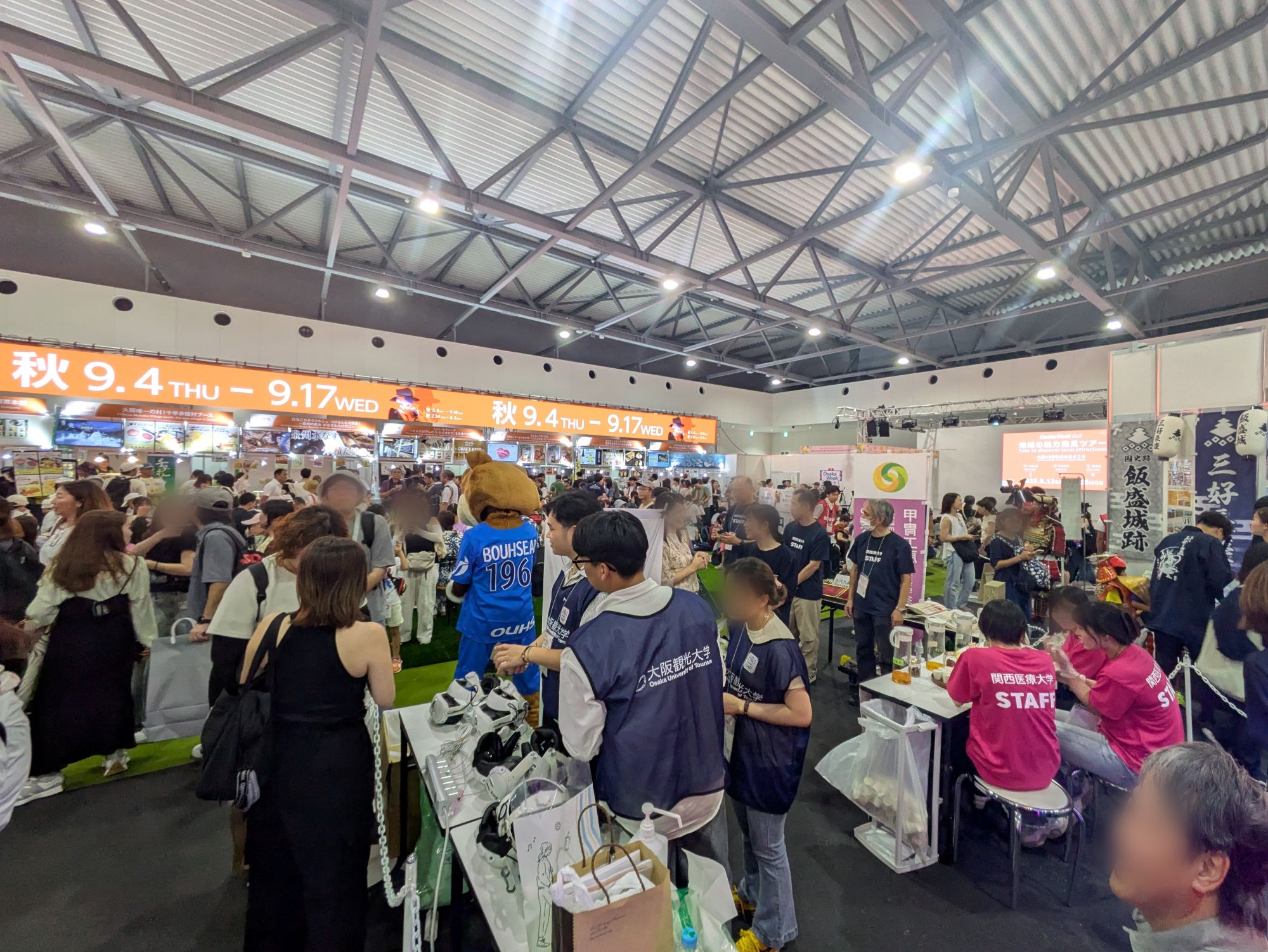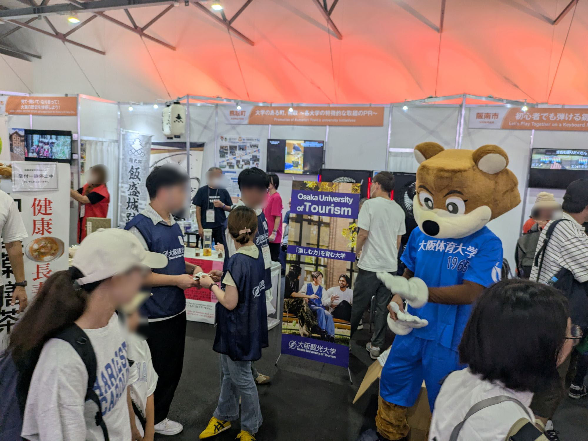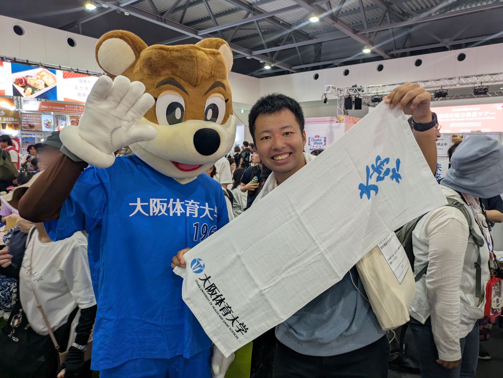 大阪・関西万博のEXPOメッセで開催された「大阪ウィーク~秋~」で、大阪体育大学が9月14日、地元の熊取町との連携事業などを紹介するポスターなどを出展し、開学60周年を迎えて今年リニューアルされたマスコットキャラクターの「BOUHSEAR(ボーシャー)」もスタッフを務めました。