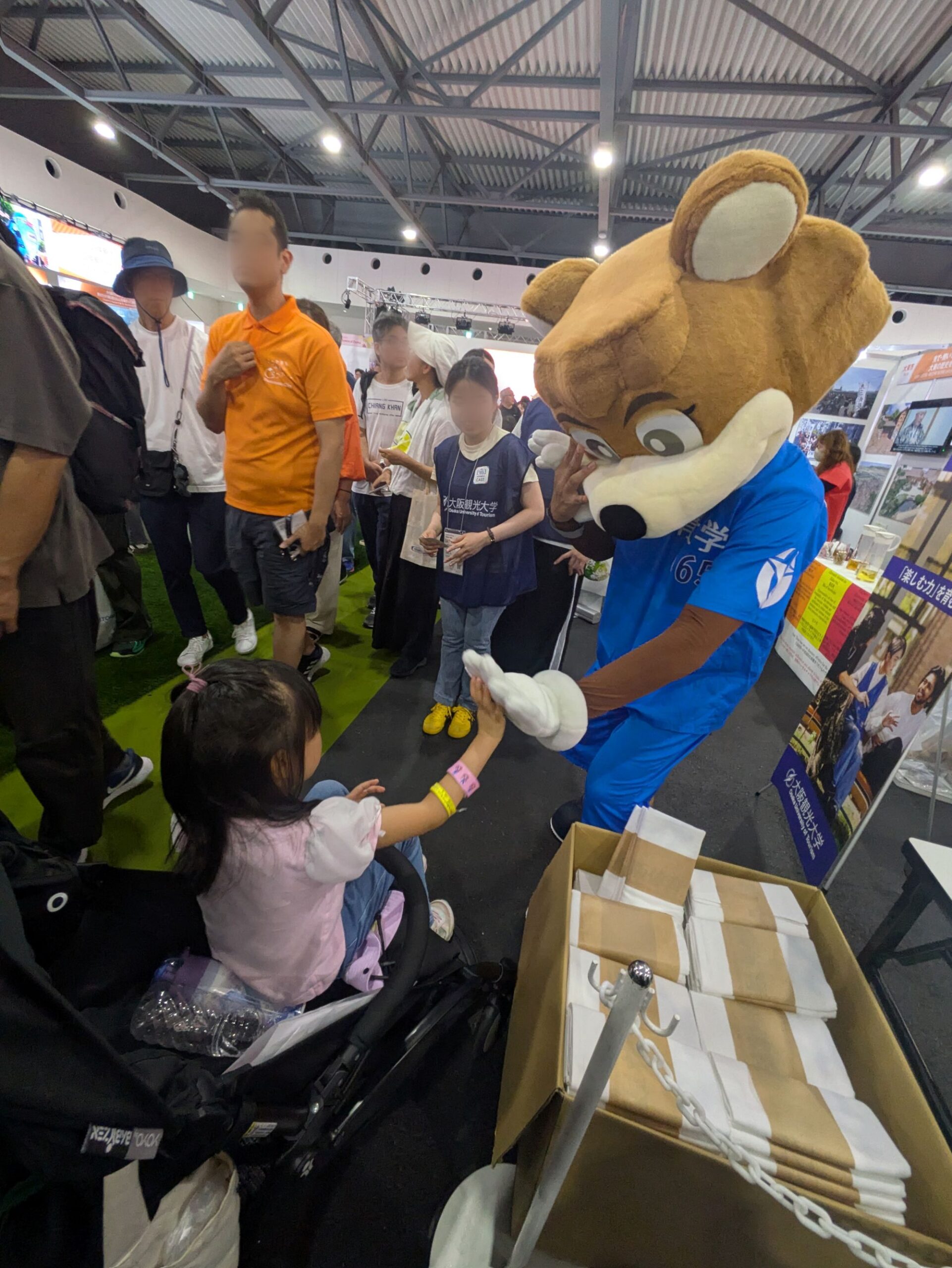 6月にリニューアルされた2代目ボーシャーにとって、この日が学外デビュー。熊取町のブースを訪れた方に大阪体育大学タオルを配りましたが、1000枚のタオルはすべてなくなりました。