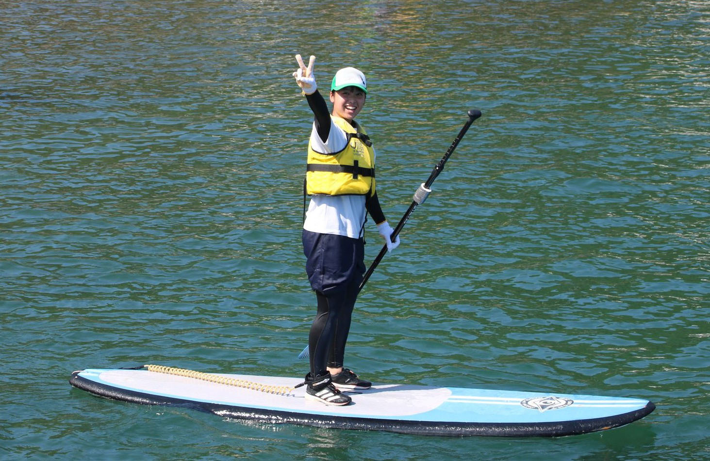 ウインドサーフィンは帆を起こした後、バランスを保ちながら風をつかむことが難しく、学生たちは何度も落水していました。一方、サップは安定感があり、一部の学生は三転倒立をするなど乗りこなしていました。