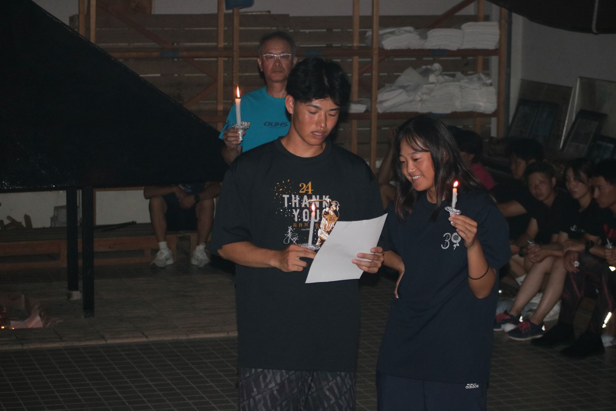 最後にセレモニアル・ファイヤーが開催され、藤本実習主任が松明(たいまつ)を持って登場。暗闇の中、厳粛な雰囲気でセレモニーは進み、実習生全員にロウソクが配られそれぞれ灯が点火されました。最後は各班の班長・副班長から班のメンバーにメッセージが送られ、ロウソクの灯を消しノスタルジックな雰囲気でセレモニーは終了しました。