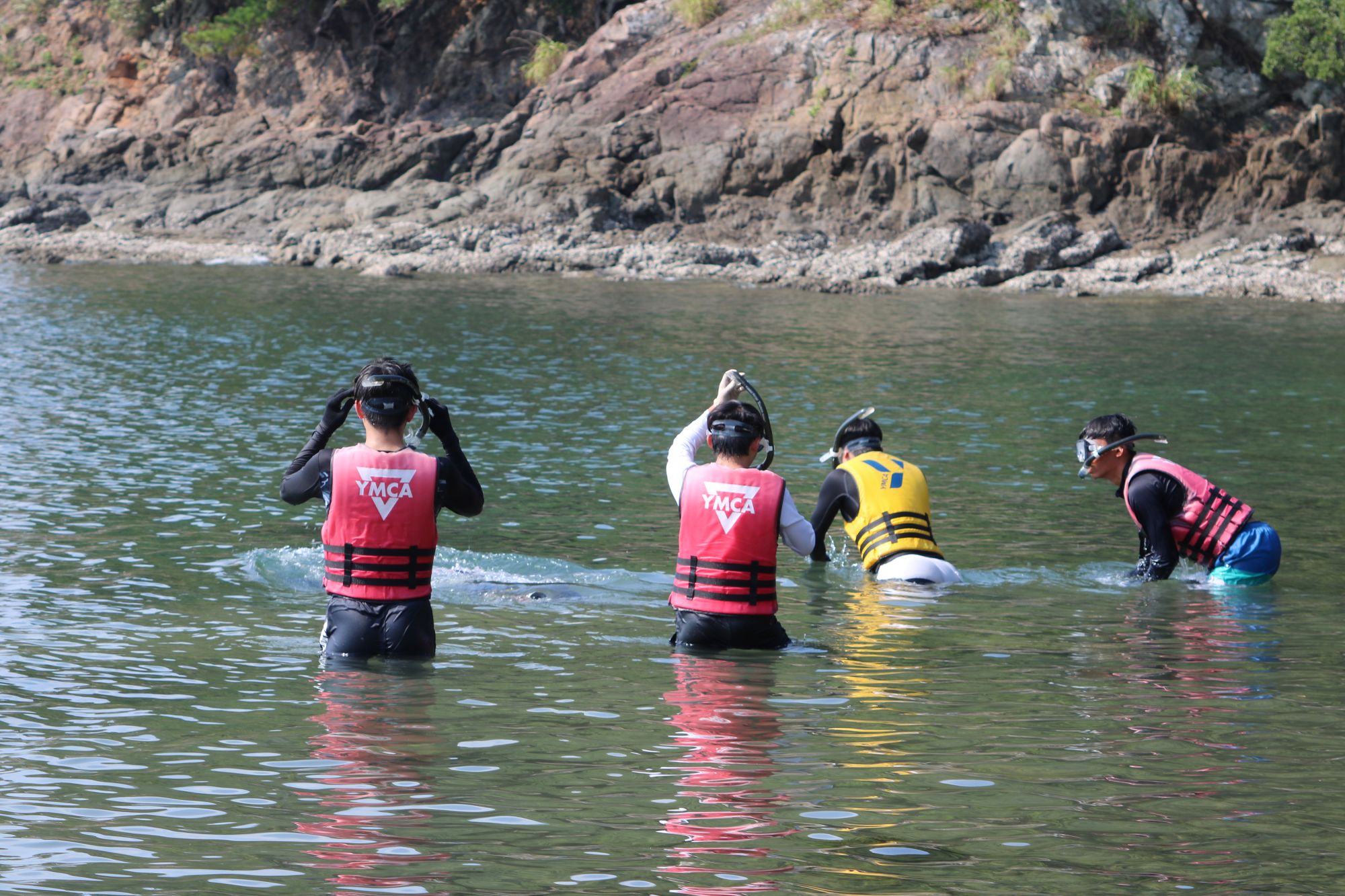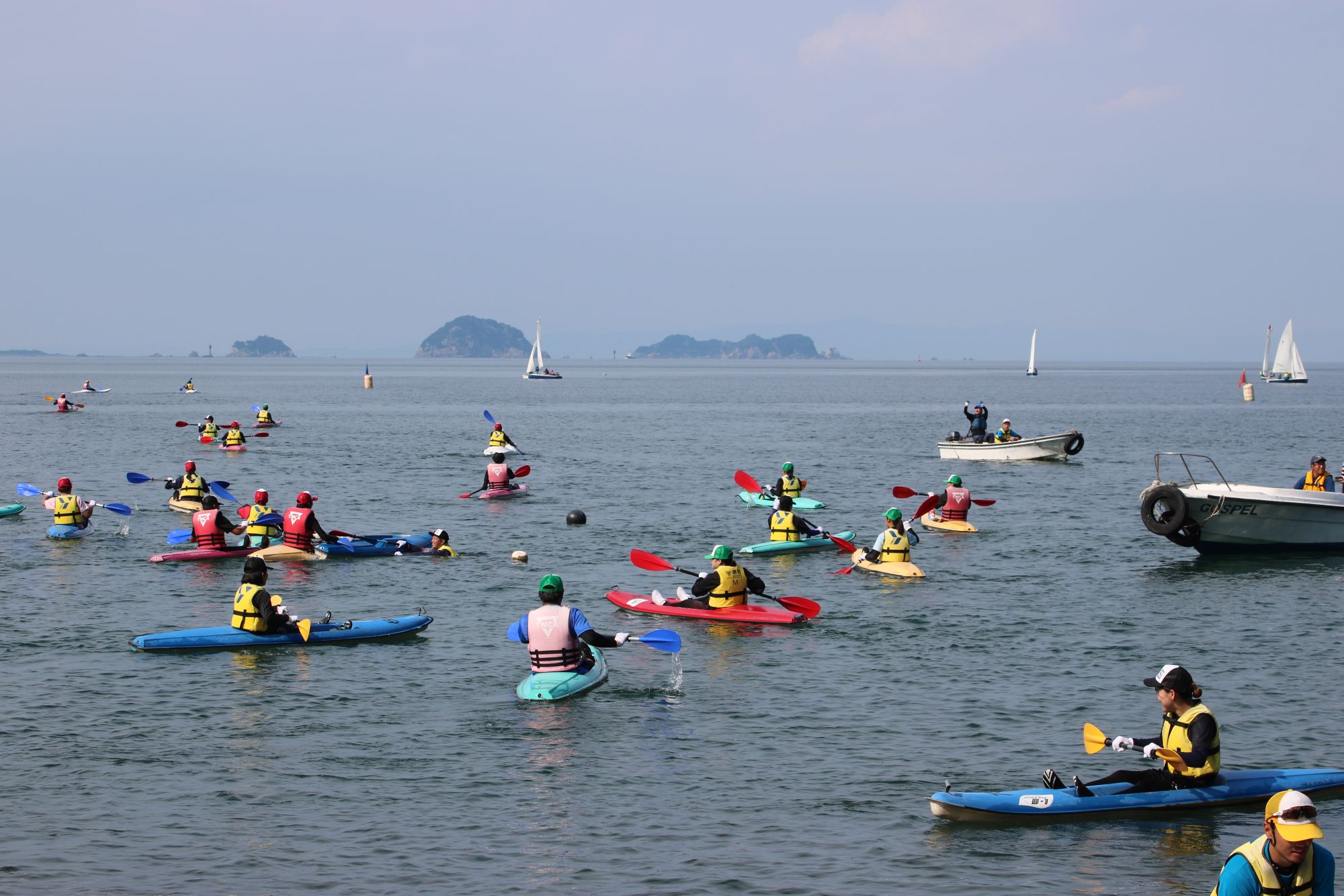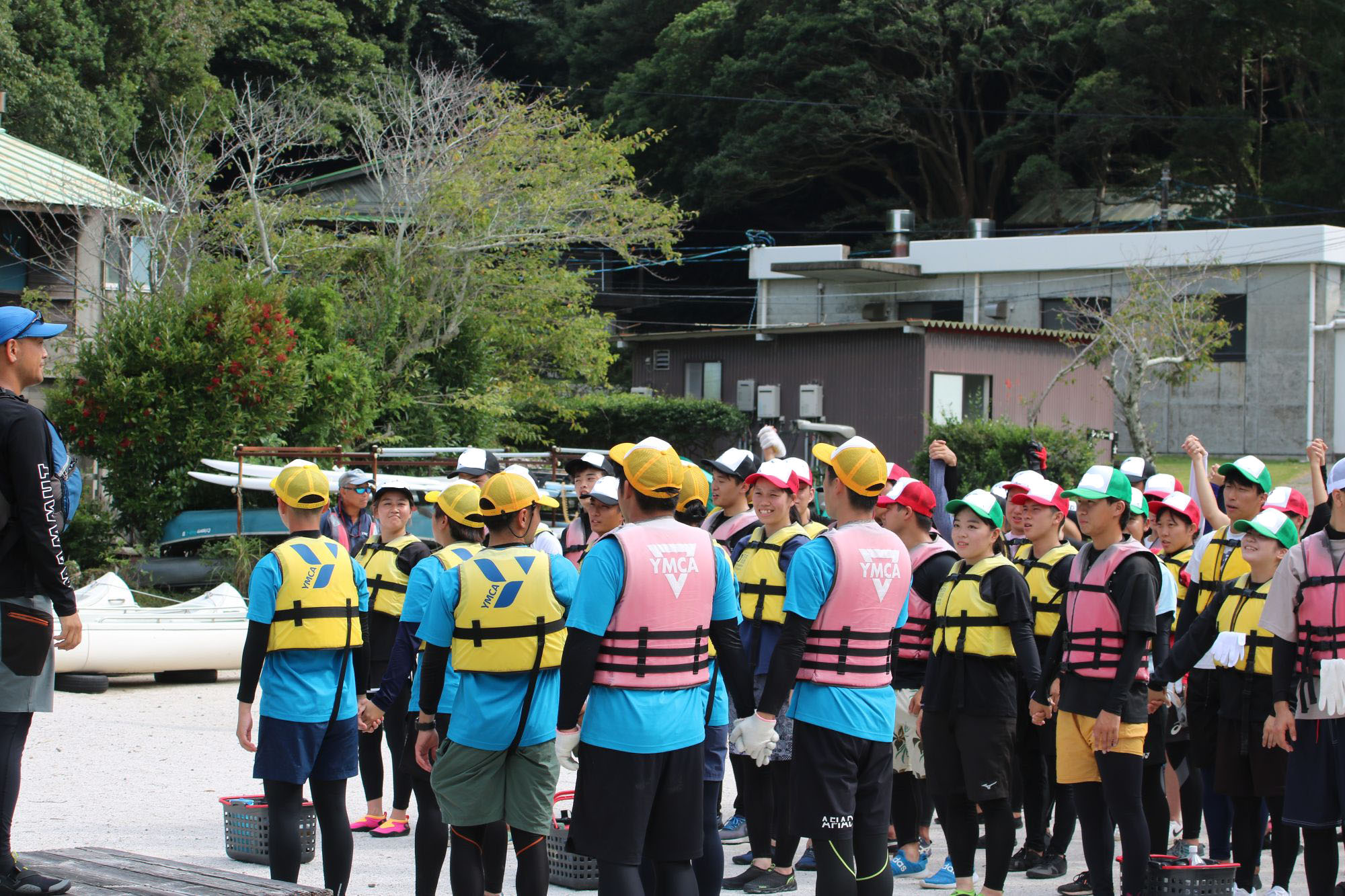 初日は天王寺駅に集合し、2台のバスに分かれて午前8時過ぎに出発。約4時間で実習会場のYMCA阿南国際海洋センターに到着しました。開講式のあとの昼食・オリエンテーションを終え、ライフジャケットの着用やバディチェックの練習を終え5班に分かれて早速カヌー、カヤックの実習を始めました。