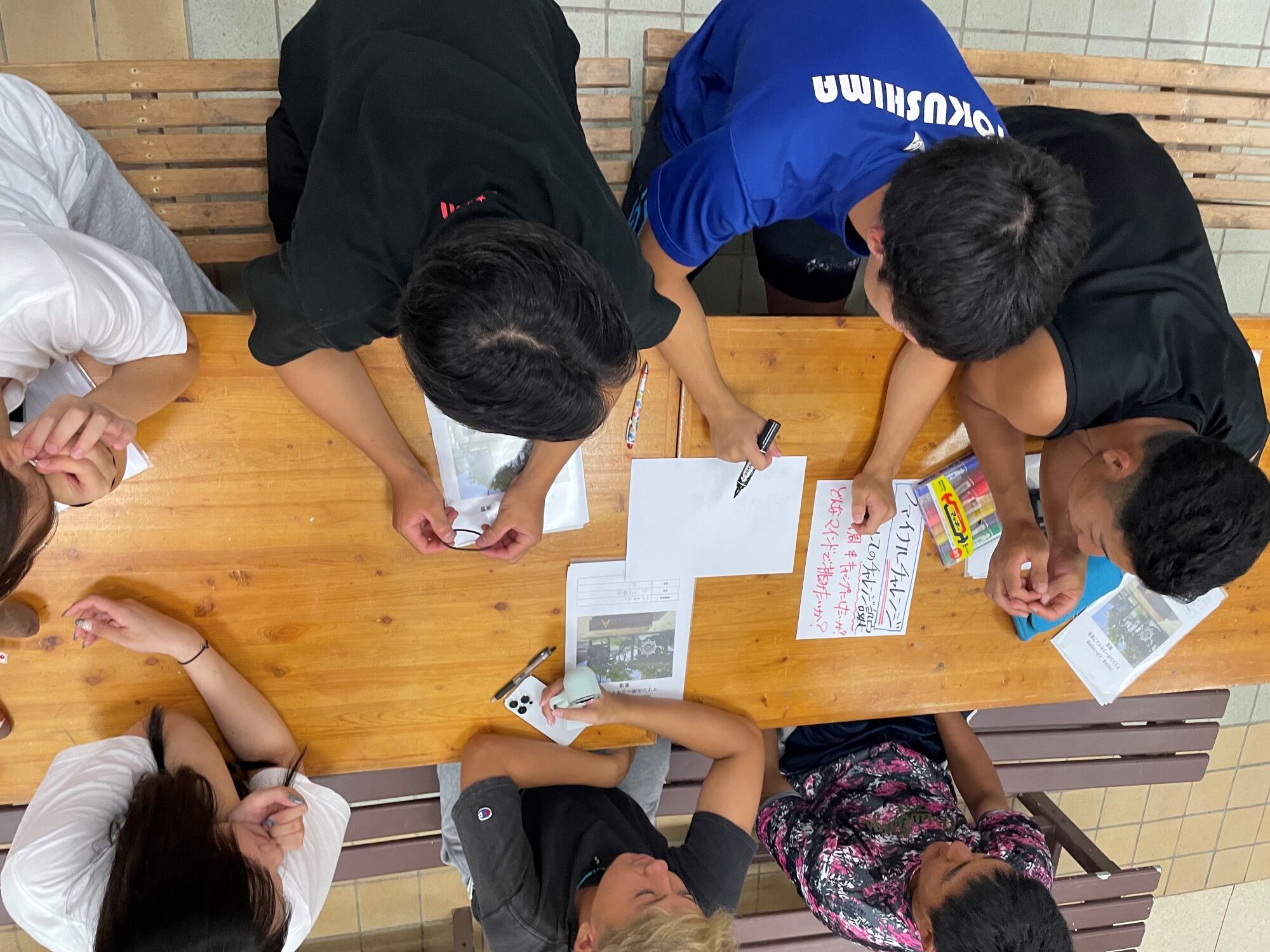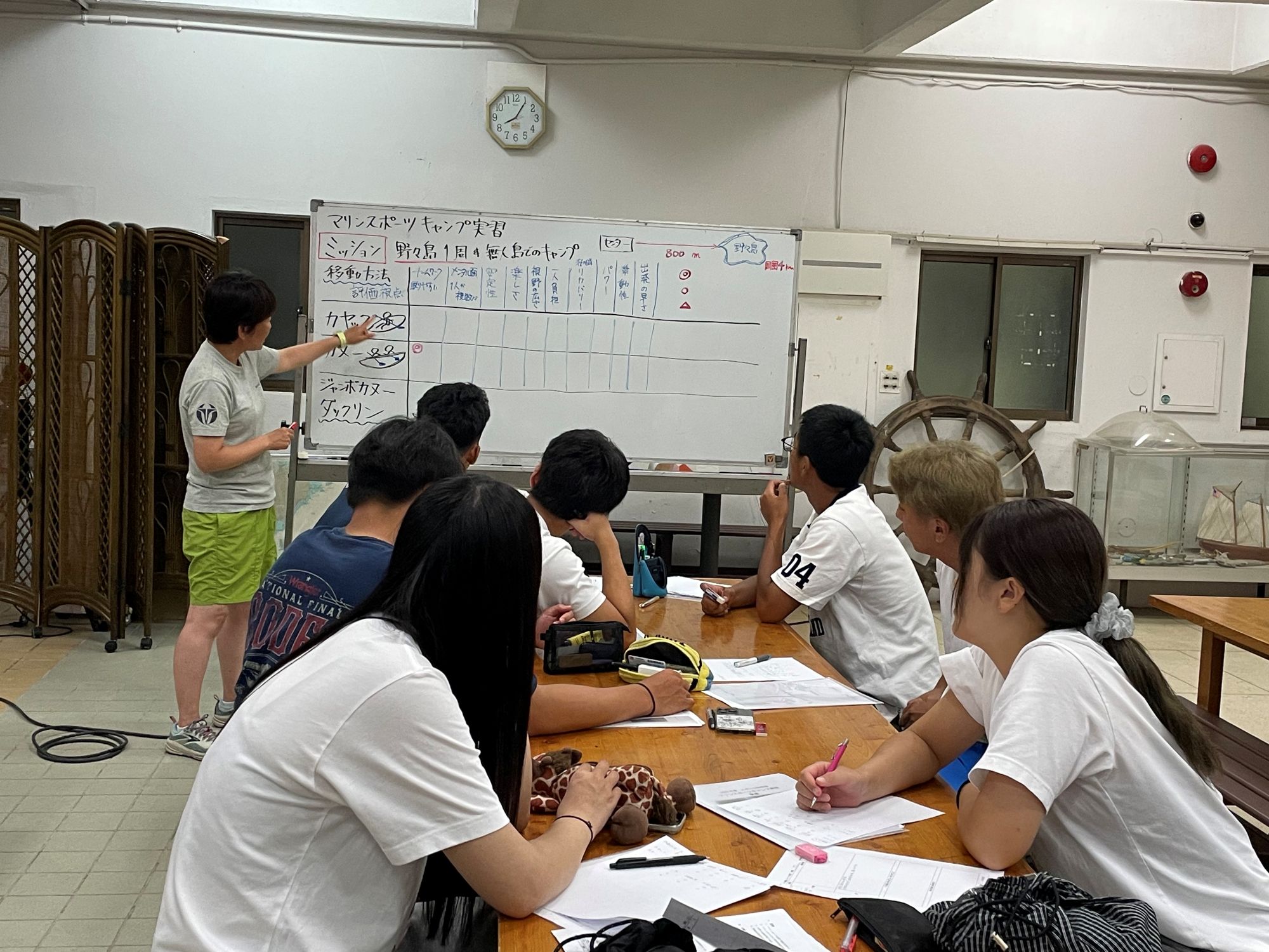 どのような移動手段で野々島を一周するか、実習生全員で検討します