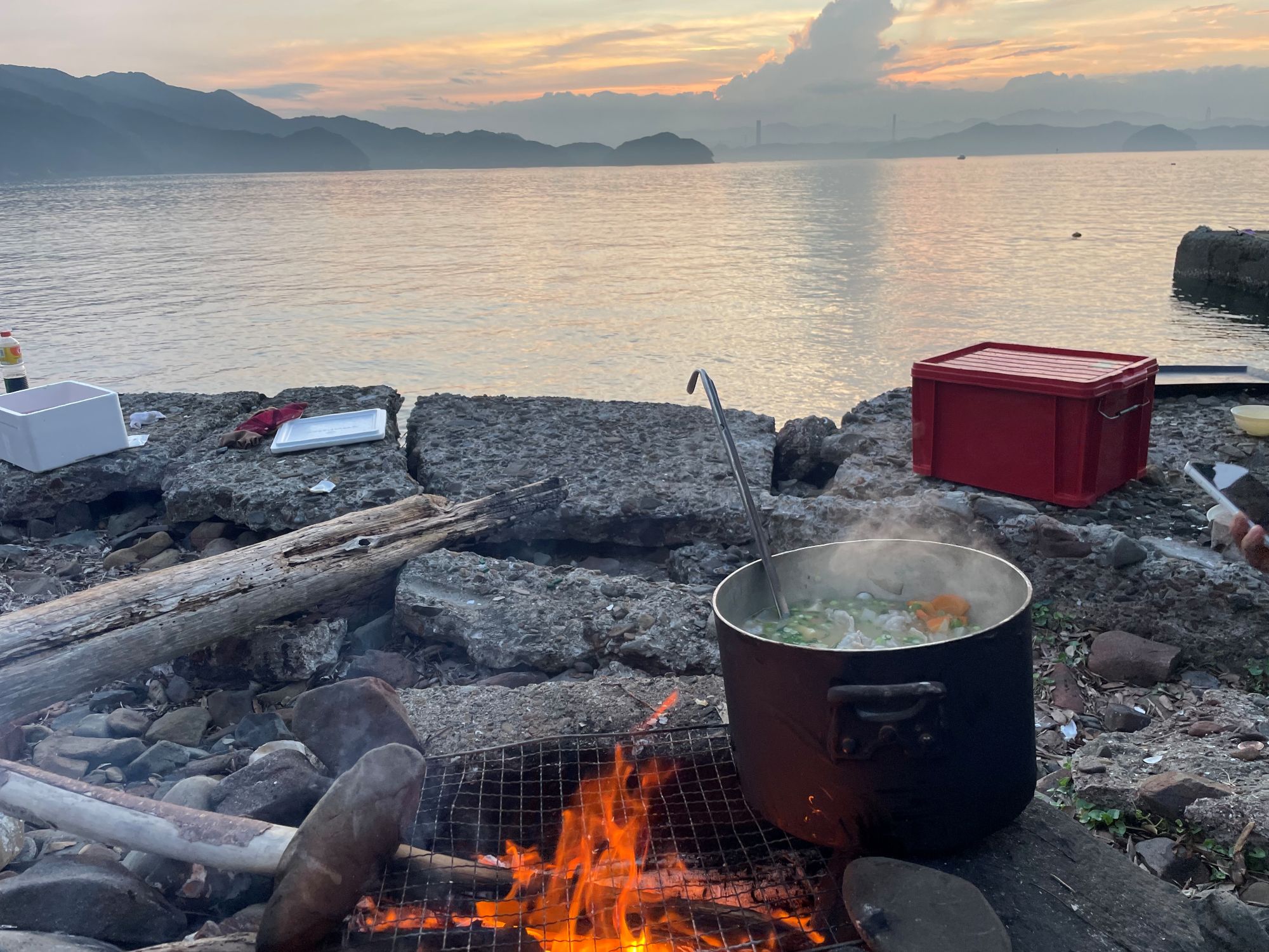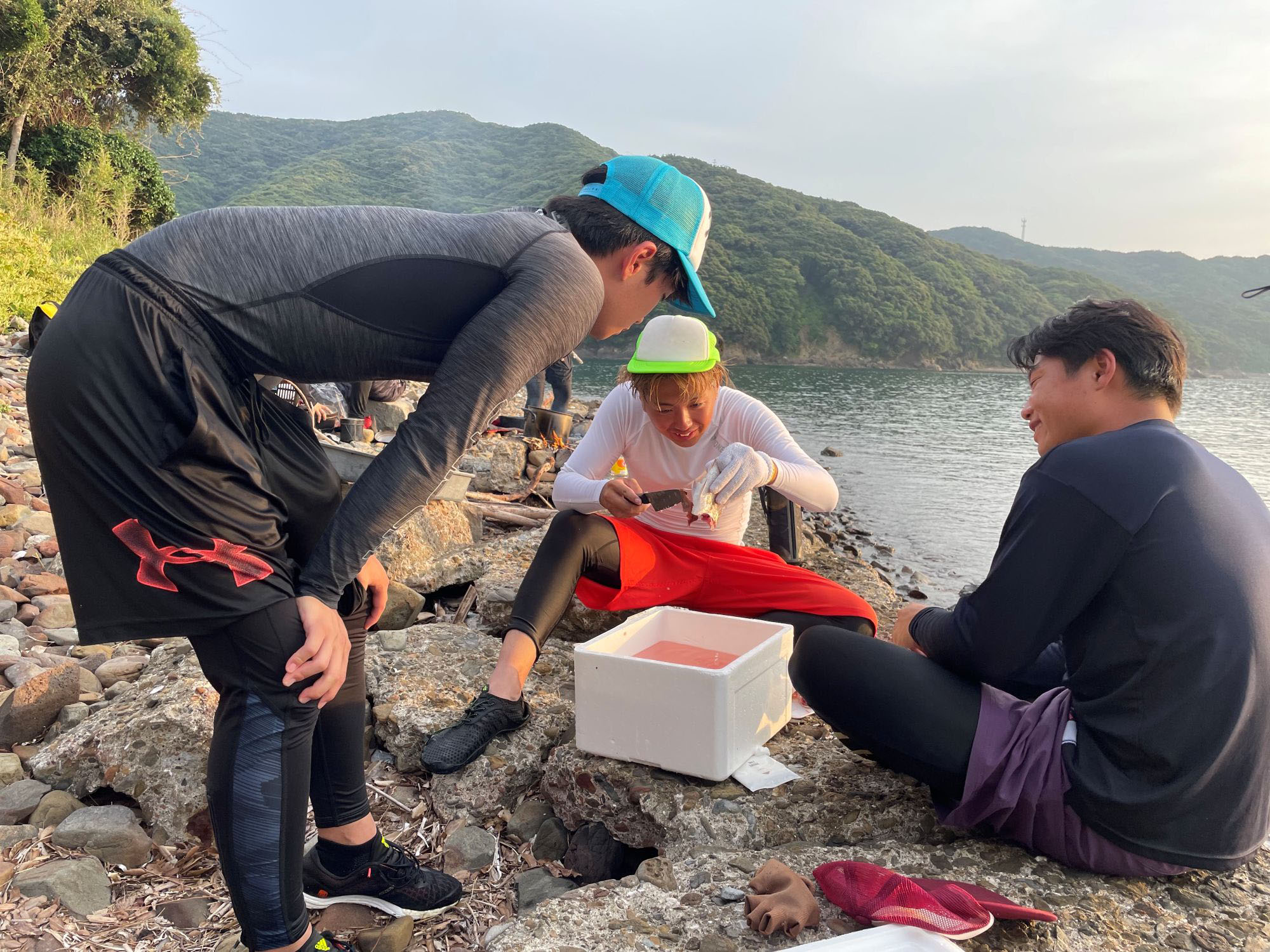 野々島で釣った魚をさばいて食事を作ります