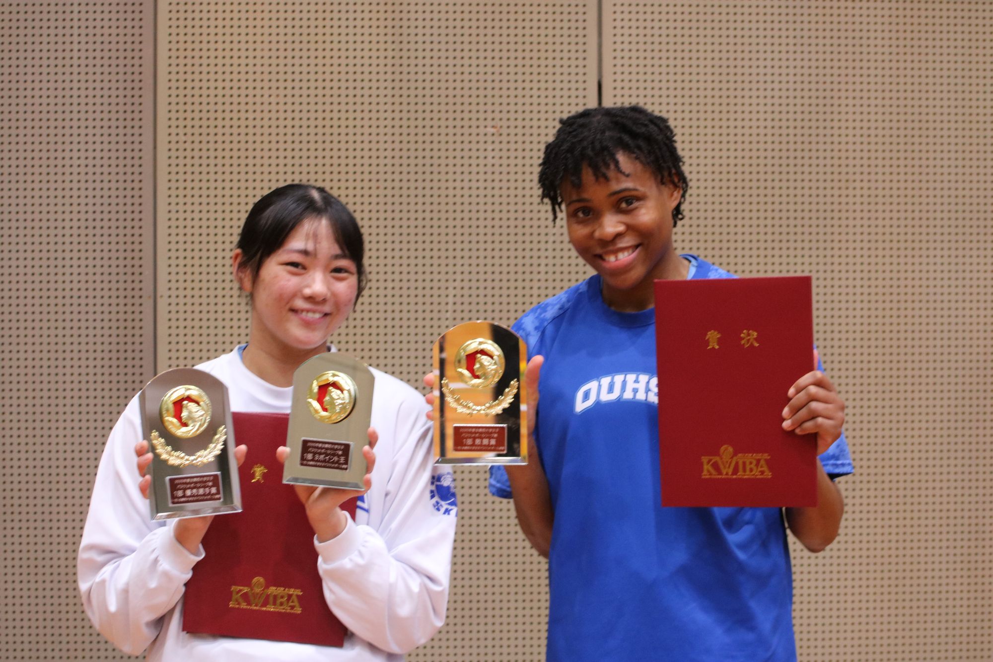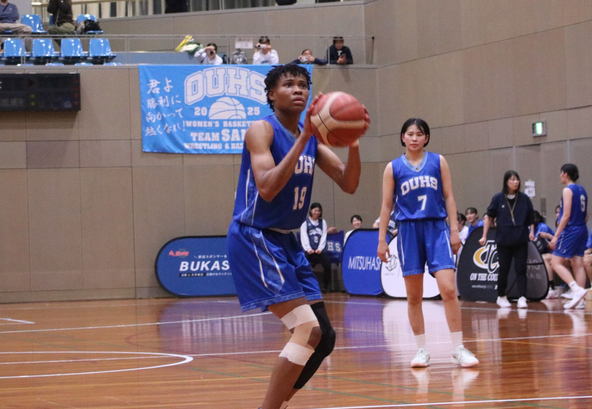 ポイントゲッターの181㌢の大上粋奈(おおうえきよな、スポーツ科学部2年、広島皆実)、180㌢のアィェビドゥン・グレイス(体育学部3年、岡山・倉敷翠松)、三次真歩(みつぎまほ、体育学部3年、広島皆実)らも随所に効果的な得点を重ね、第3クォーター終了時には41対39でわずかにリード。第4クォーターでは23得点を挙げ64対59で勝利となりました。