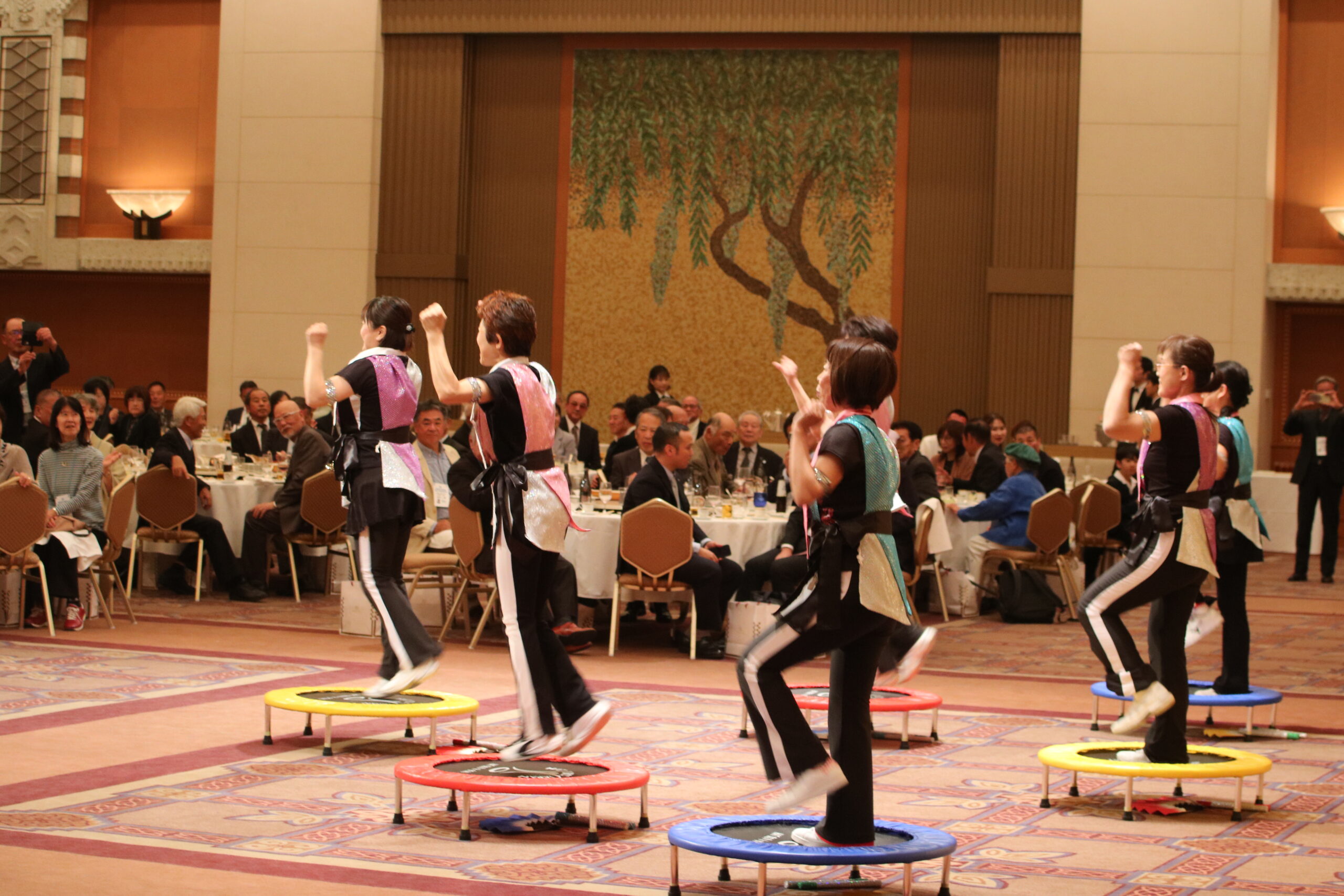記念式典の後に開催された祝賀会では摂泉会の井上紀子副会長が「これからも皆さんお元気で、体大のためにお働きいただけますようにお願いします」と開会の辞を述べ、松村新也同窓会顧問による乾杯の発声で参加者は歓談。会の途中ではなぎなた部による演舞や卒業生の市来崎家族による武術太極拳の演舞、中国の伝統芸能である変面ショー、エアロビクスにトランポリンを取りいれたトランポ・ロビックスも披露されました。