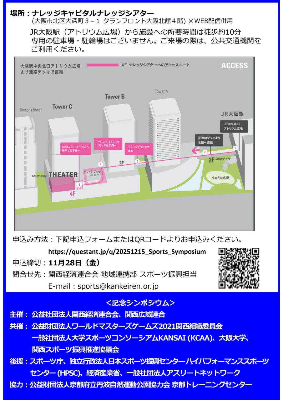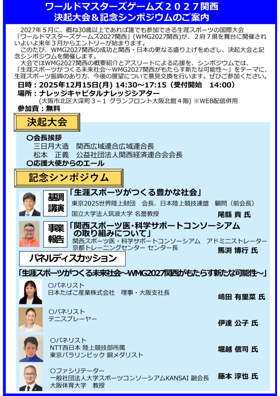 記念シンポジウムでは、パリオリンピック日本選手団長で東京2025世界陸上財団会長の尾縣貢さん、関西スポーツ医・科学サポートコンソーシアム・アドミニストレーターの馬渕博行さんが講演するなど、各界の第一線で活躍する方々が登壇します。