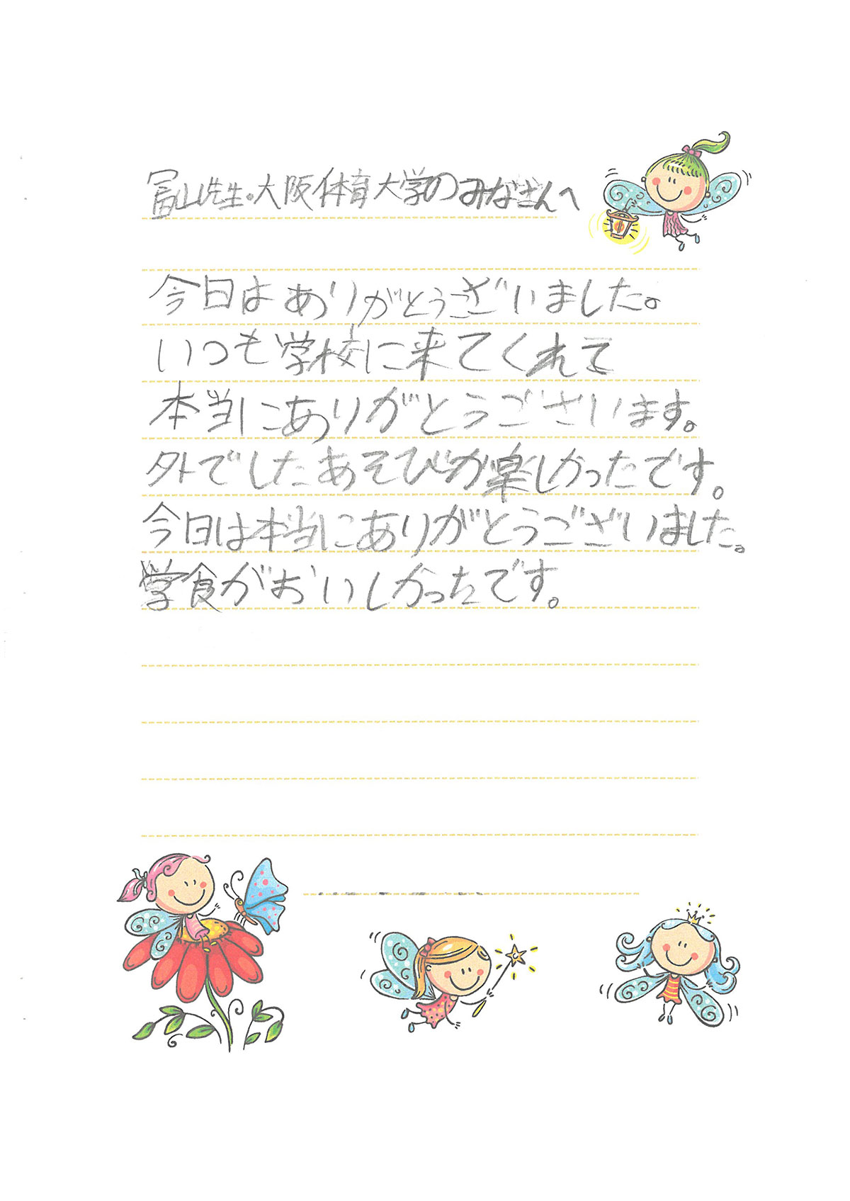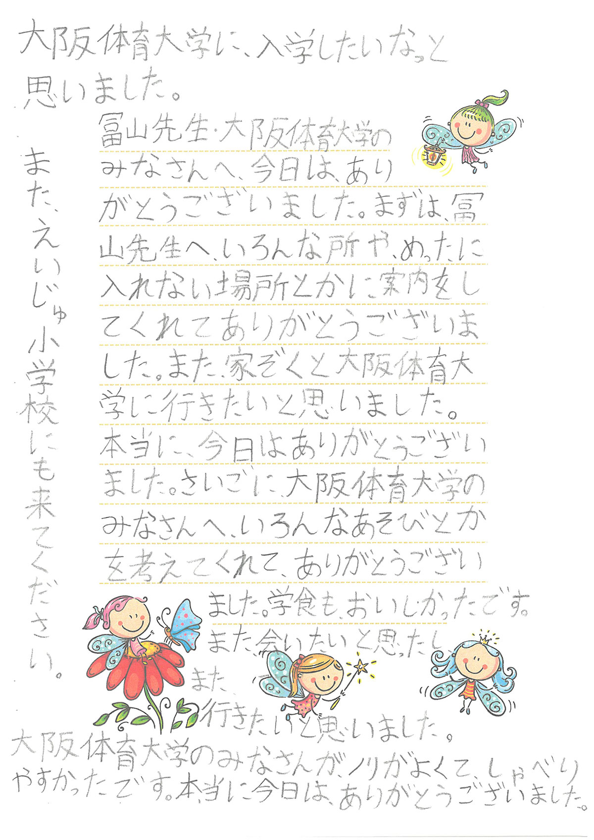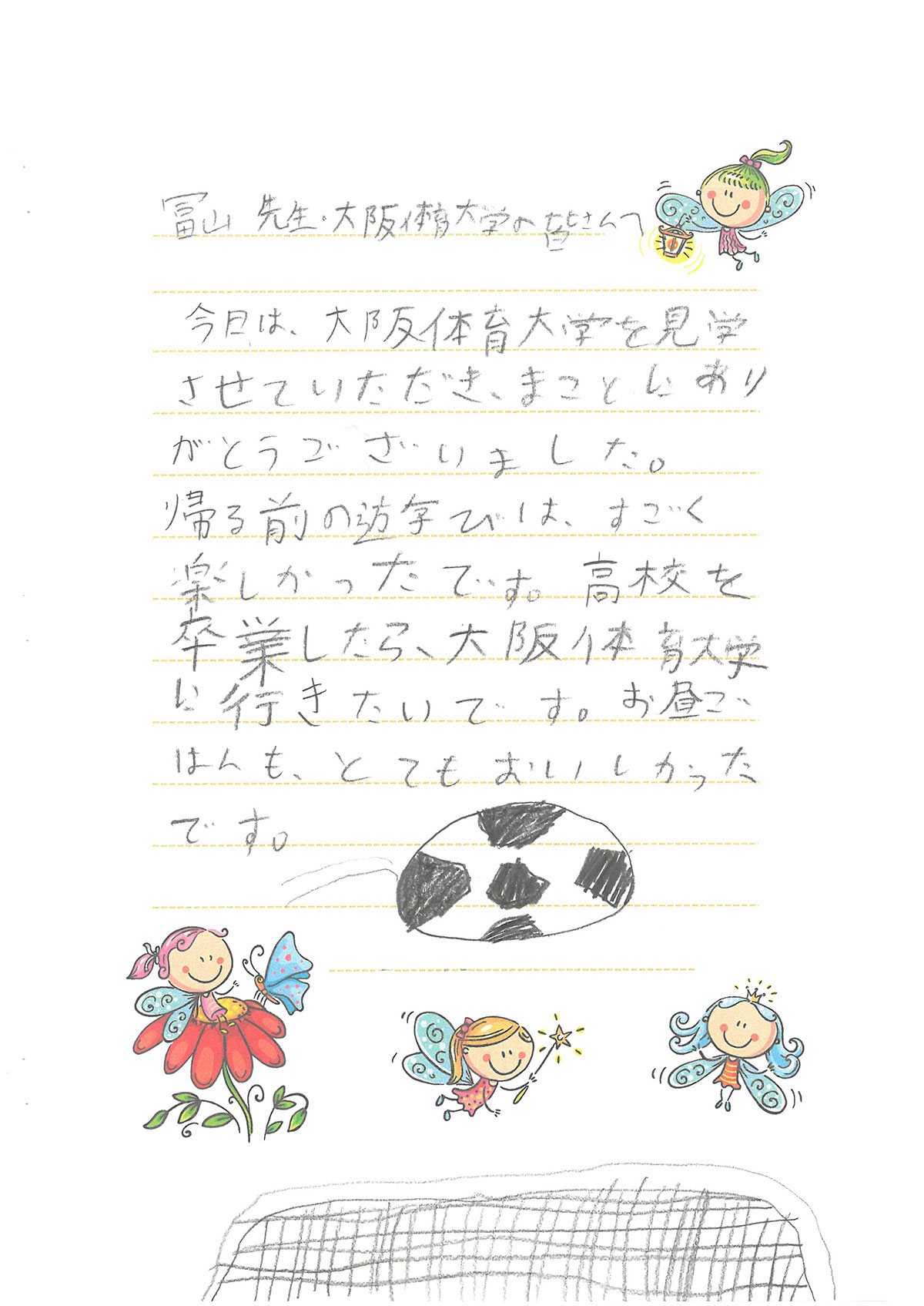 後日、児童1人1人からお礼の手紙が届きました。「体操のふかふかマットに乗れてよかった」「大学のみなさんのノリがよく楽しかった」「フットサルが面白かった」「学食がおいしかった」「大阪体育大学に入学したいなと思いました」などとつづられていました。