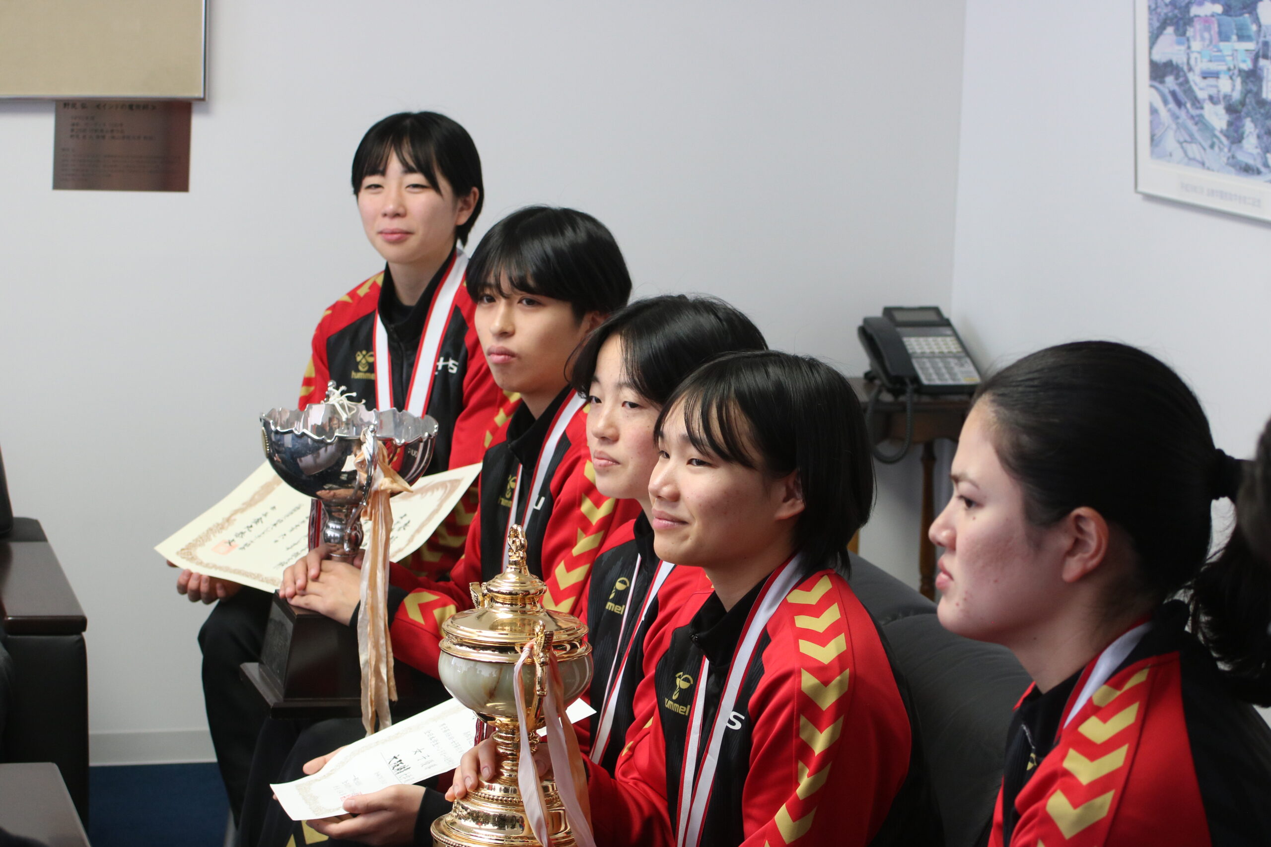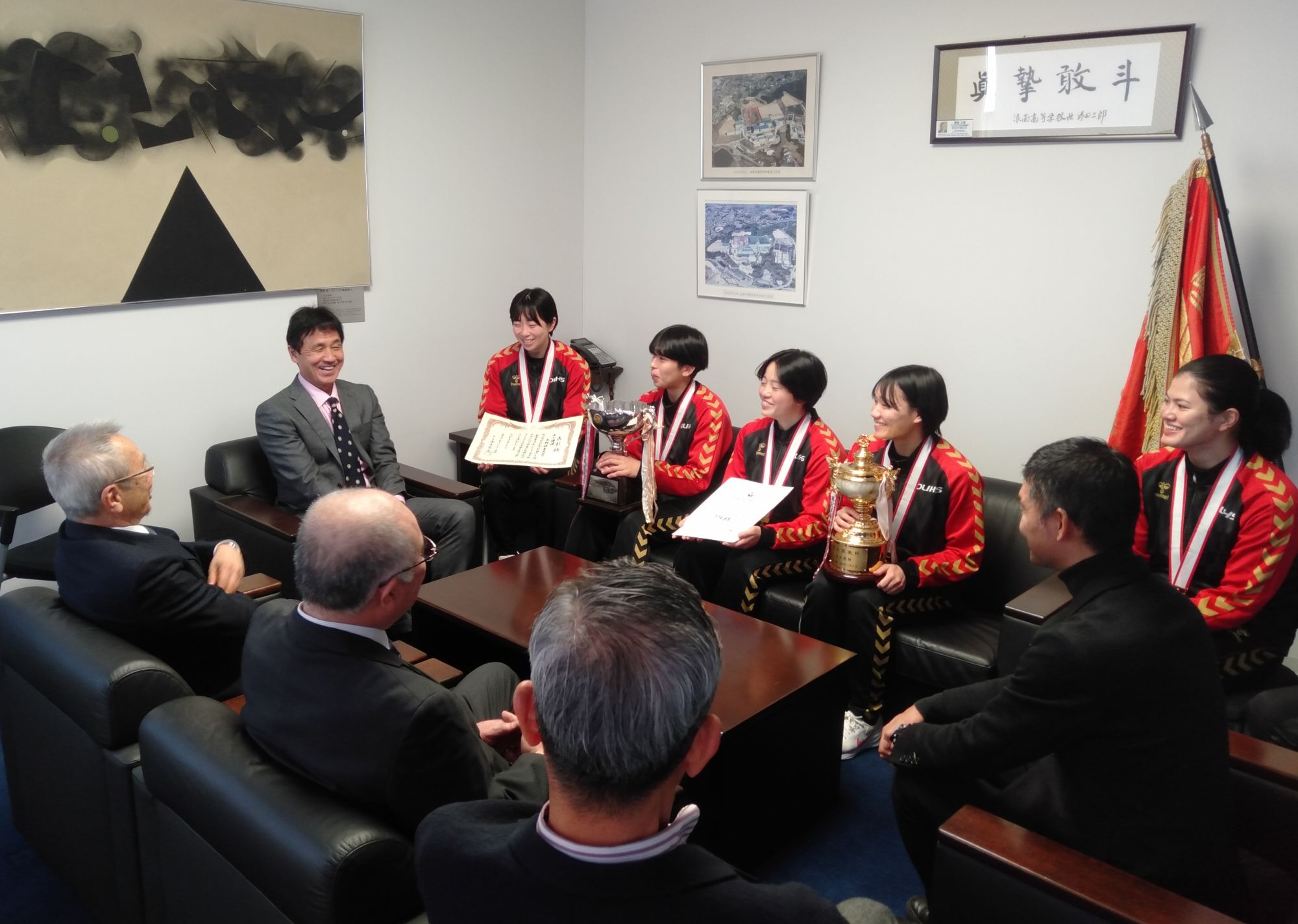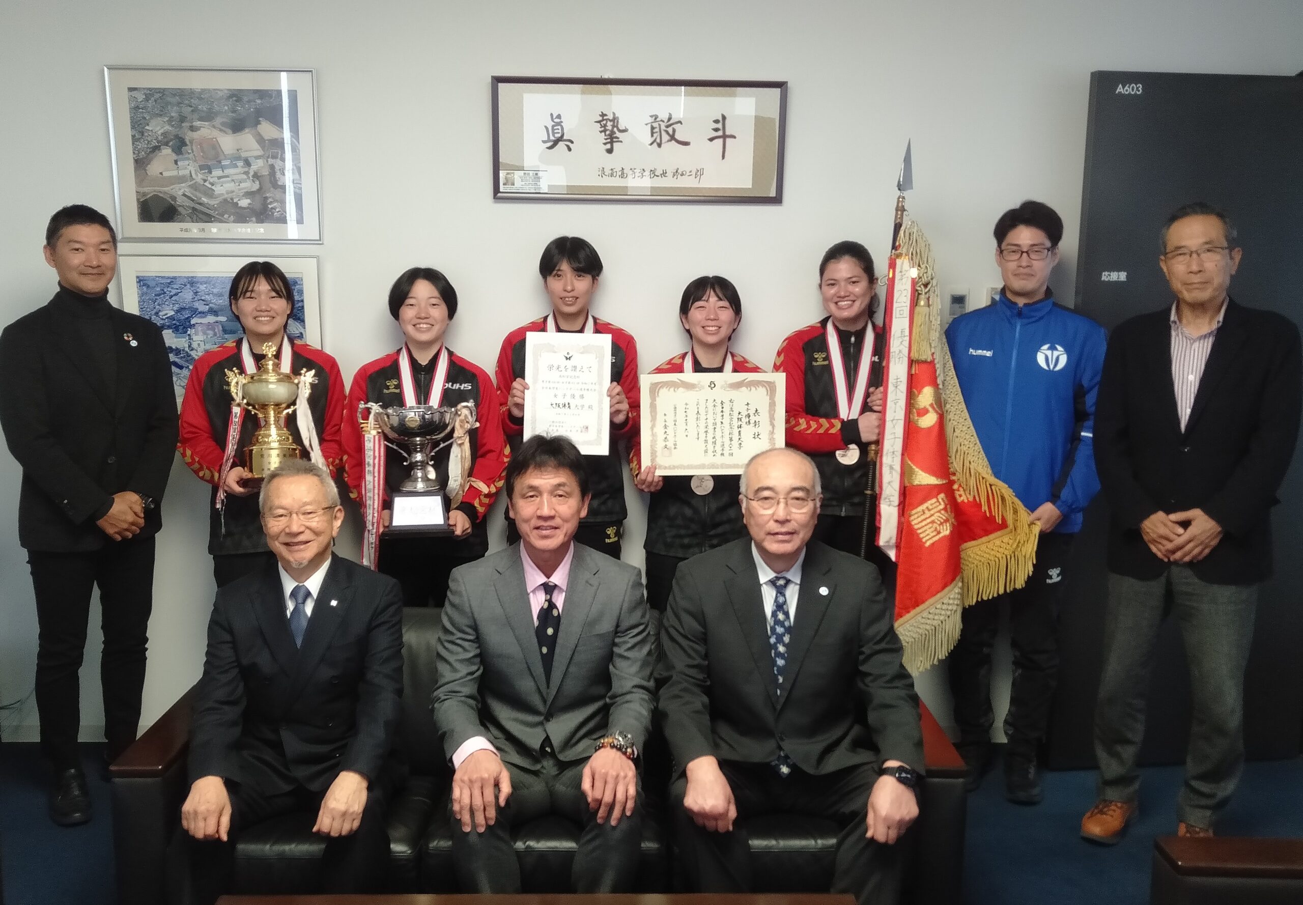 主将の高来葵美(あいみ、体育学部4年、石川・小松商業高校)、優秀選手賞を受賞した奥山紗彩(さあや、体育学部4年、大阪・四天王寺高校)、坂下碧(みどり、体育学部4年、富山・高岡向陵高校)、比嘉楓(体育学部4年、沖縄・那覇西高校)各選手と特別賞の小林実杜選手(みと、体育学部4年、大阪・四天王寺高校)、楠本繁生監督、𠮷本遼コーチ、小林博隆部長が、野田理事長、神﨑浩学長、梅林薫スポーツ局局長と懇談しました。