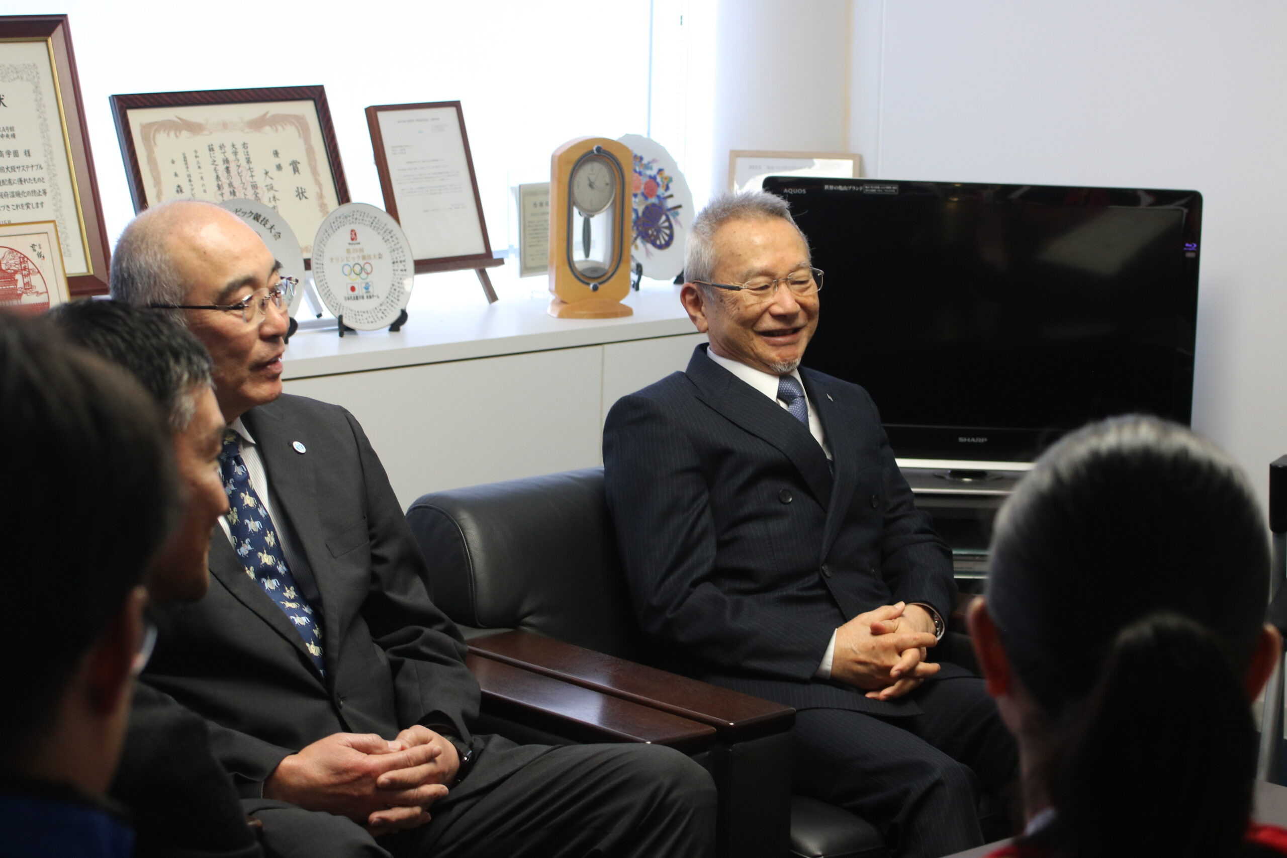 選手たちと談話する野田理事長(右)と神﨑学長(左)
