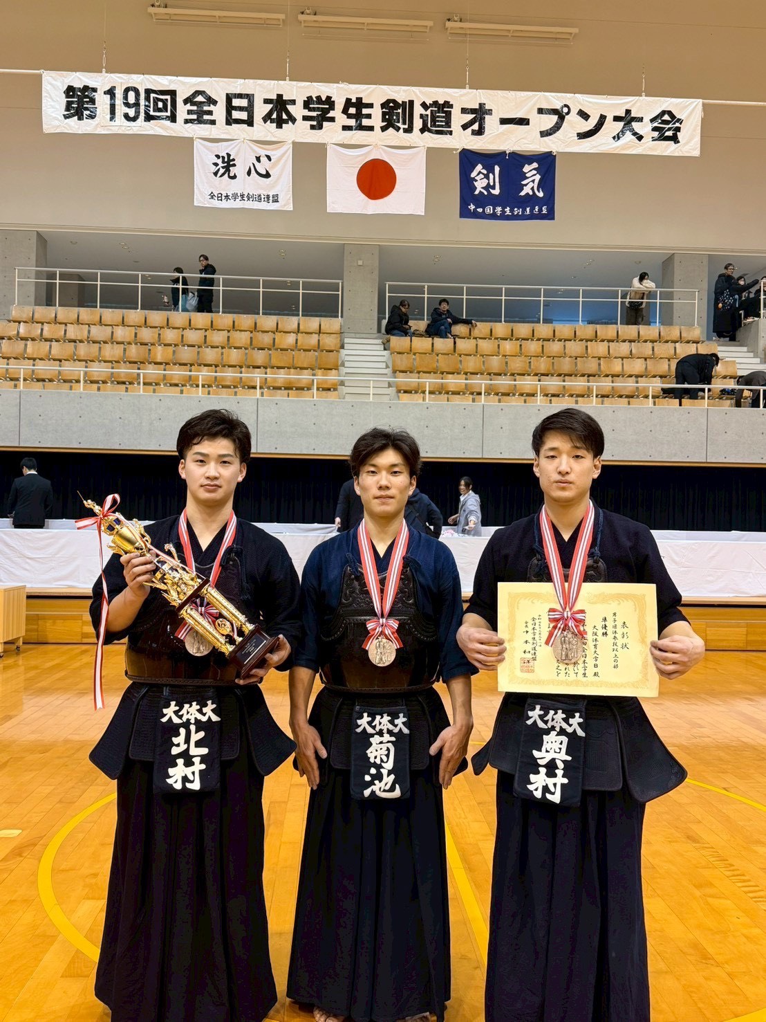 団体戦の第19回 全日本学生剣道オープン大会が12月20~21日、シゲトーアリーナ岡山で開催され、男子三段以上の部で、奥村龍也(体育学部4年、福井・敦賀高校)、菊池金太郎(体育学部4年、福岡・福翔高校)、北村壮志(体育学部4年、大分・明豊)のチームが準優勝しました。