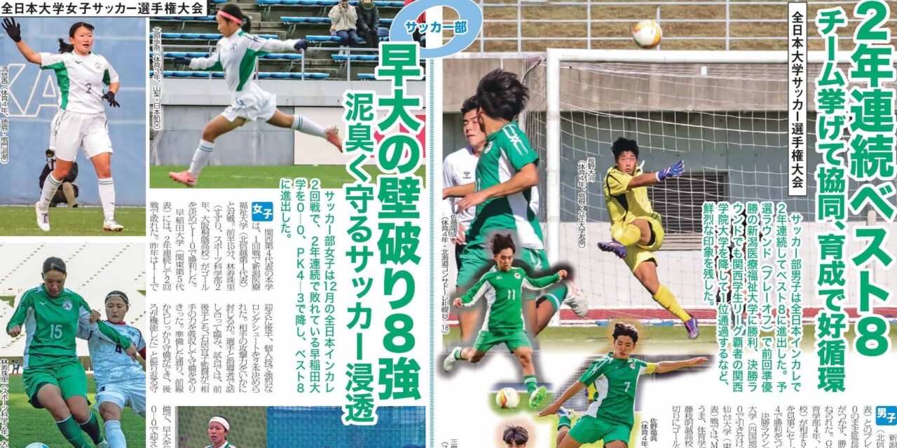 トップは、全日本インカレで男子は前回準優勝校と関西王者を撃破し、女子は2年連続で苦杯をなめた早稲田大学を降して、ともにベスト8と健闘したサッカー部。また、陸上日本選手権の女子砲丸投げで1年生ながら優勝し日本一となったスーパールーキー・坂ちはるにフォーカスしました。