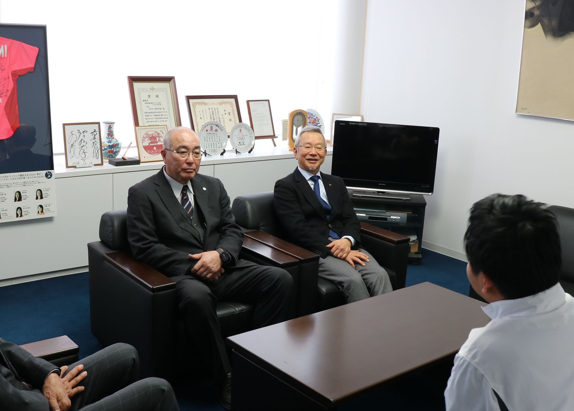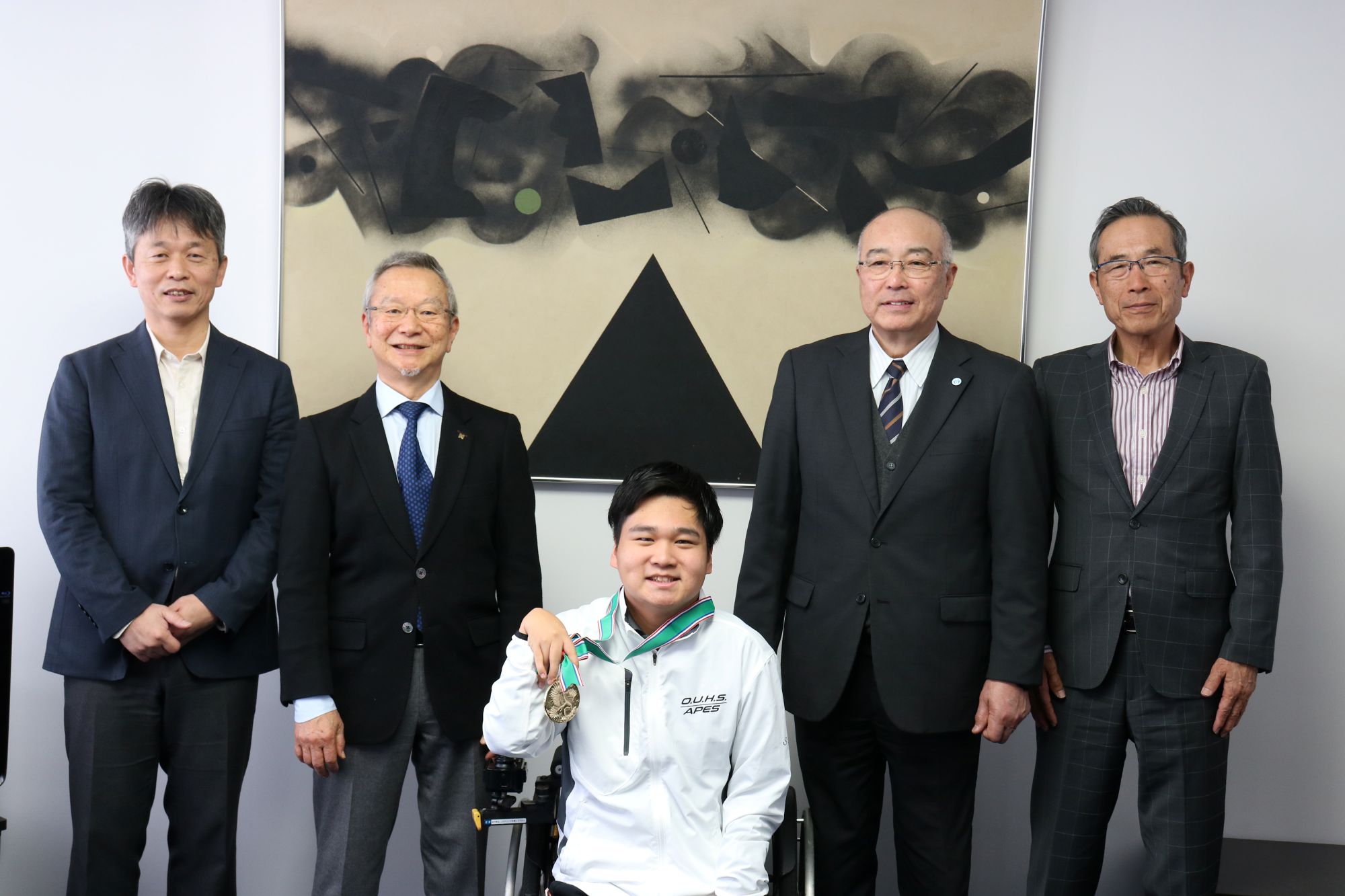第27回日本ボッチャ選手権大会で4度目の日本一を達成した内田峻介選手(大阪体育大学大学院スポーツ科学研究科博士前期課程1年)が1月29日、野田賢治理事長、神﨑浩学長、梅林薫スポーツ局長に優勝を報告しました。