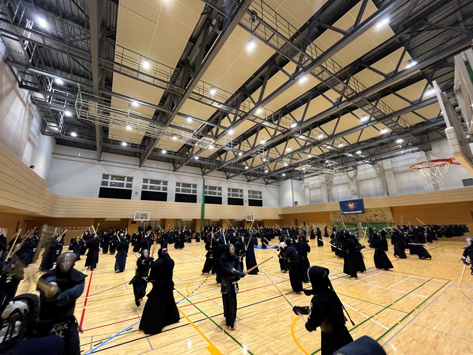 寒稽古には剣道部員のみならず、大阪府内の各所や他地域から小中高校生や大学生、一般の剣道愛好家、韓国、台湾の大学生、本学の卒業生も遠方から参加しました。かなりの大人数のため、普段の稽古場所である剣道場ではなく、第6体育館アリーナを代用しています。