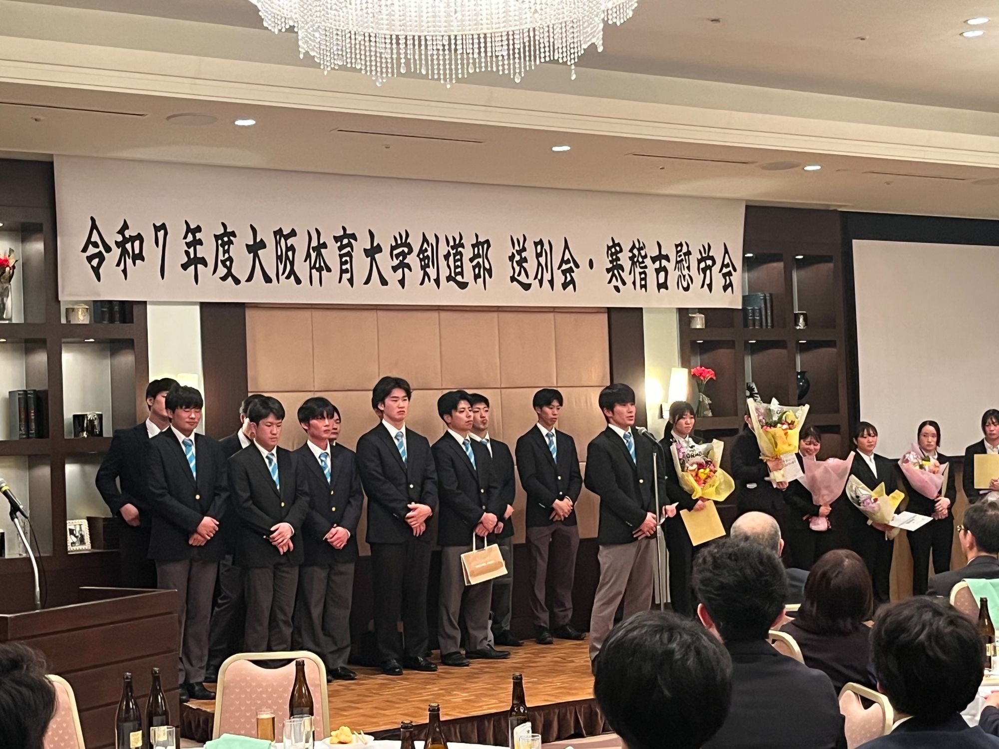 その後、大学の部員、OB・OGらはスターゲイトホテル関西エアポートで送別会・寒稽古慰労会を開催。引退する4年生がそれぞれの思いをスピーチするなど、涙あり笑いありの会は大盛況で幕を閉じました。