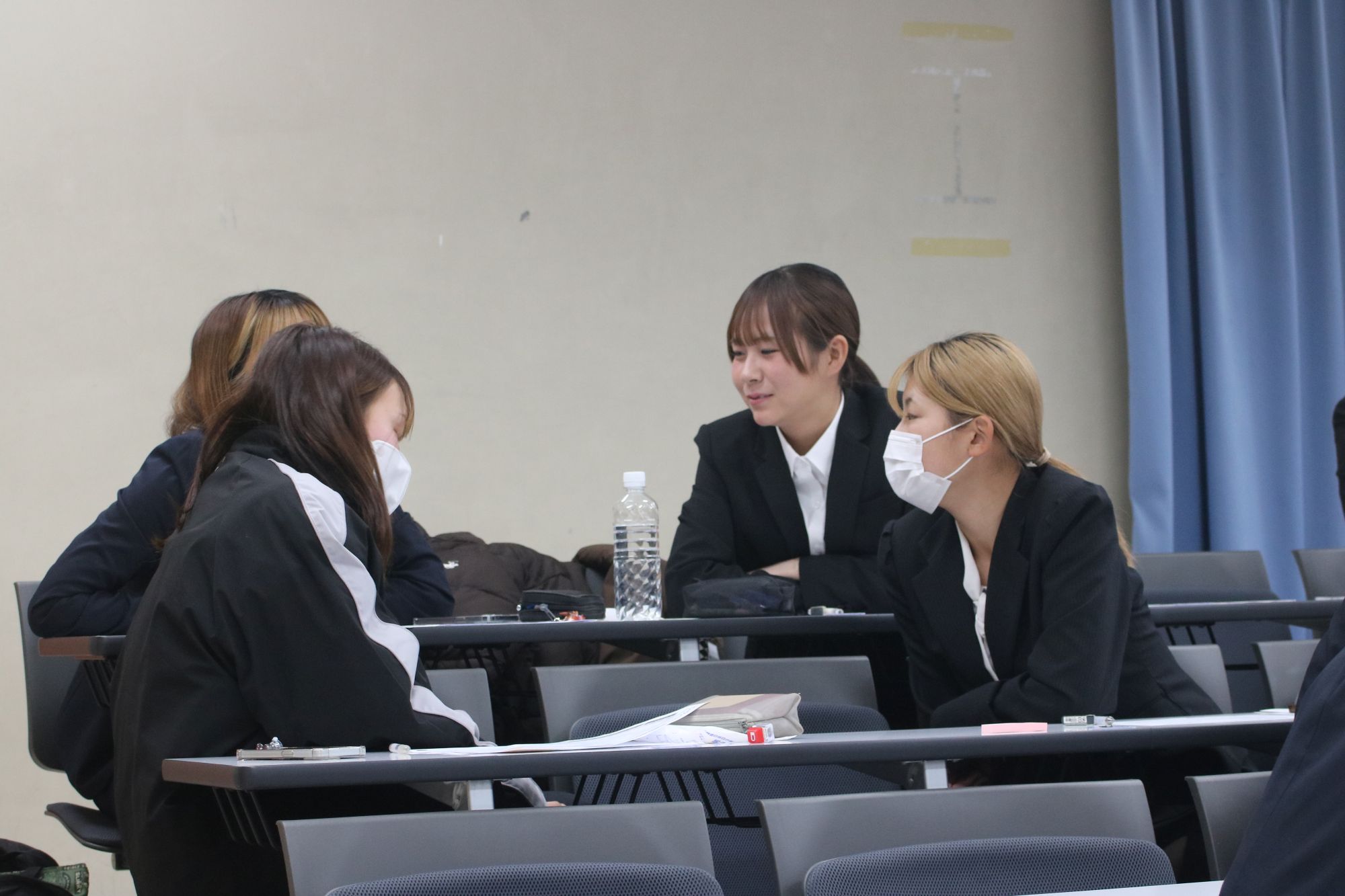 2年生はC号館2階から4階までの13会場の中で興味のある内定者の教室を選んで参加しました。プロ野球独立リーグの徳島インディゴソックスに内定している大仲菜奈さん(体育学部4年、大阪・久米田高校)や地元の兵庫県中学校教員に内定している原田茜さん(体育学部4年、兵庫・宝塚西高校)ら26名の4年生が、就職活動を始めた時期、工夫したこと、教員採用試験の勉強方法などの経験談を話し、後輩から活発な質問が出されました。