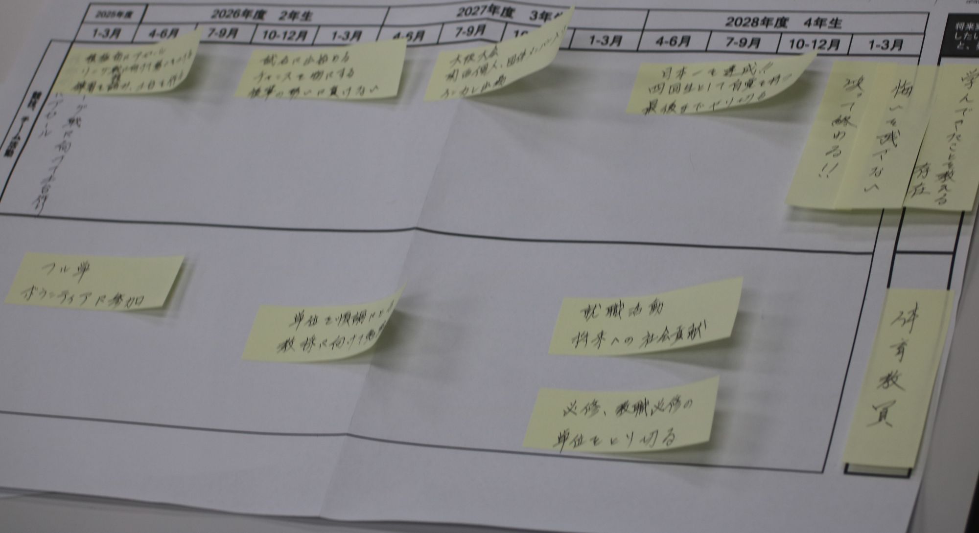 講師のパネル・ディスカッションを聞いた後は、前後左右の学生同士でグループとなり、自身の志向や好きなことをざっくばらんに話しまました。そのうえで自身のロードマップを作成し、将来実現したい理想や目標を考えるきっかけを作りました。