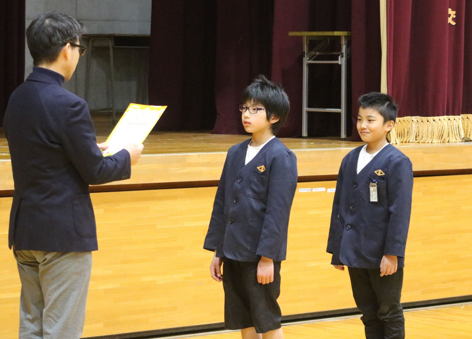 表彰式には全校児童が参加し、辻内首席が司会を務めました。初めにコクヨ株式会社の福井正浩執行役員、長尾菜穂さんから授賞理由が紹介されました。福井執行役員は「10名の児童が大阪体育大学を含む何か所も訪問して、合計2000名近い人々に協力をお願いしてくれたと聞き、その行動力と勇気に感動しました。もう一つ、みんなが集めてくれたノートは150㌔を超えましたが、これだけノートを作るとなると、木材4本分が必要です。この取り組みで環境を守る、世の中に役立つといった活躍をしたことが受賞の理由です」と話しました。