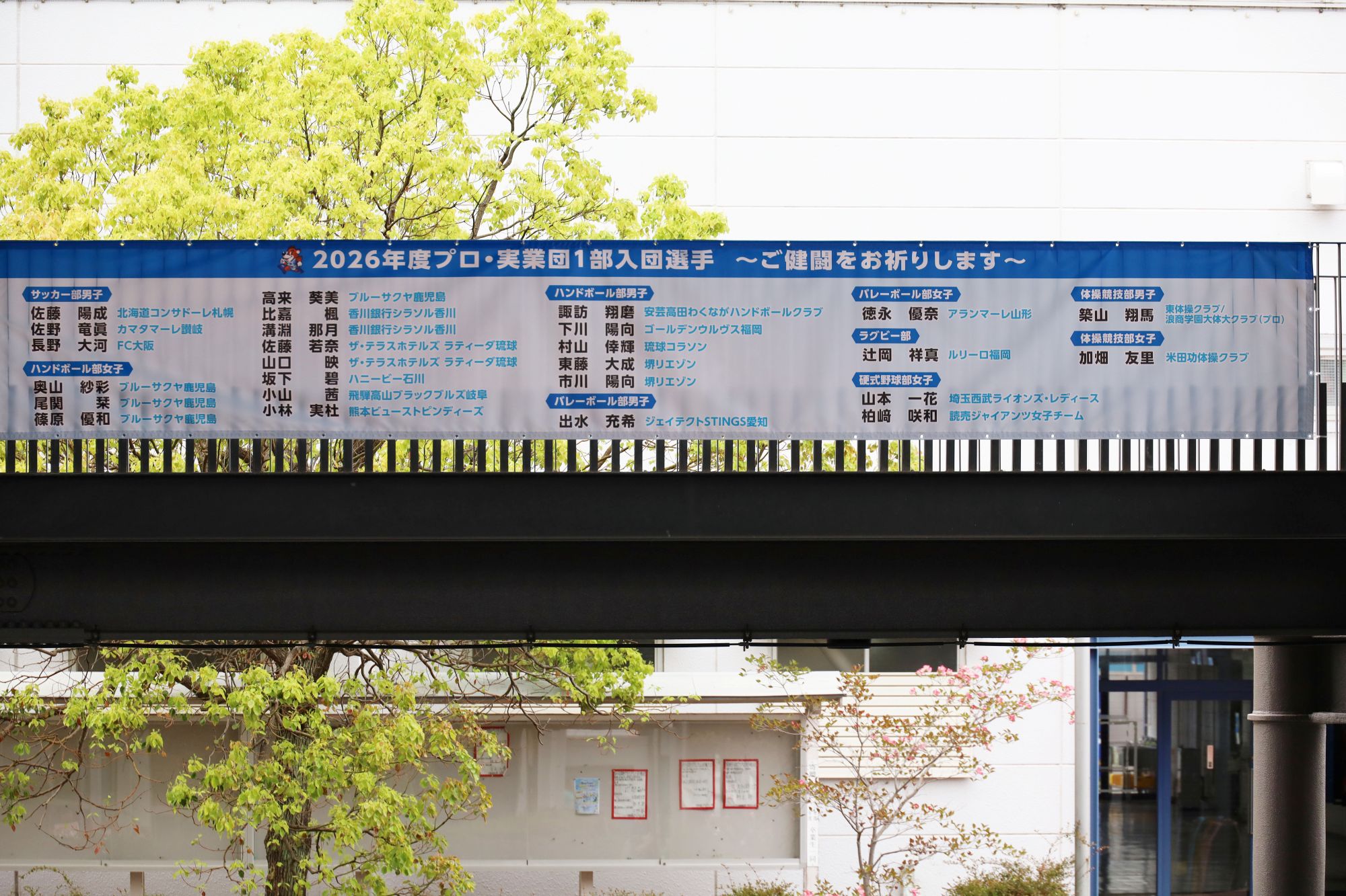 2026年度に各競技のトップカテゴリーのプロ・実業団(1部)に加入、プレーする選手の横断幕が、中央棟スカイプロムナードに登場しました。体大出身選手の活躍を祈念しています。