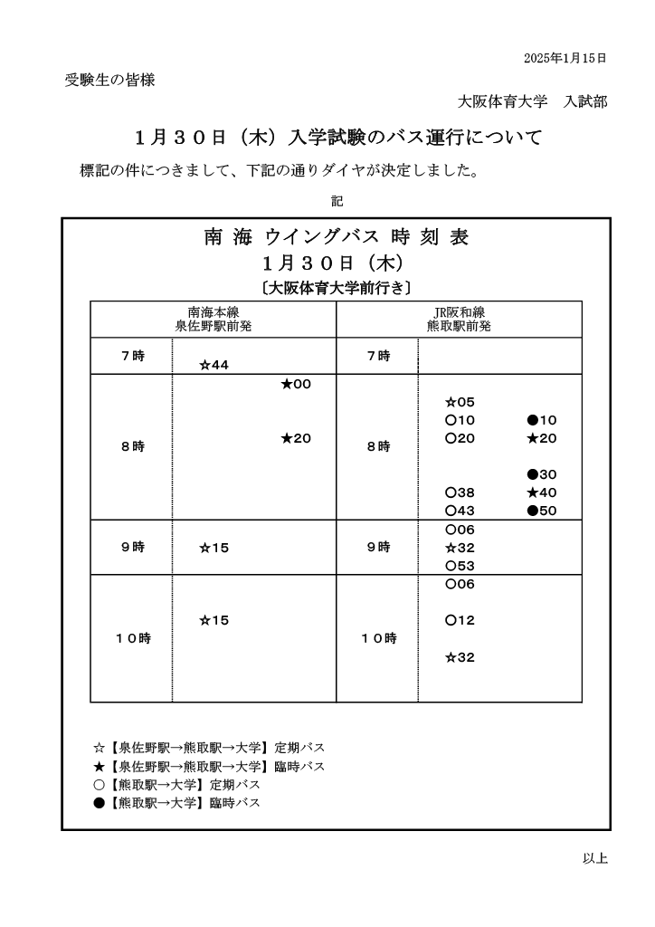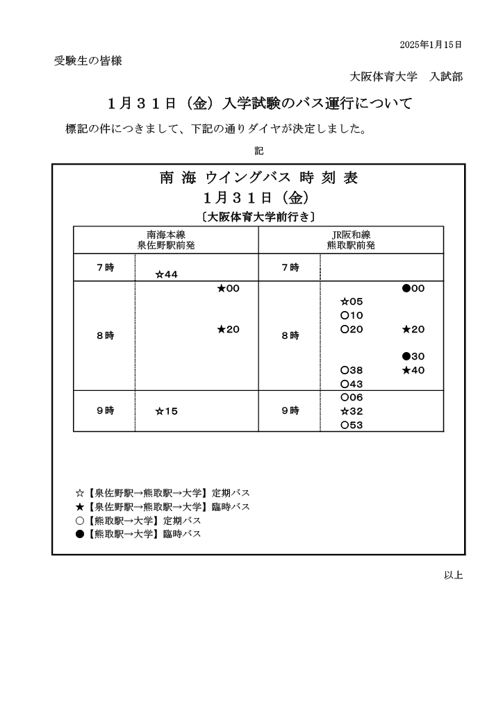 2025.01.15 2025年度 一般選抜・スポーツ特別総合型選抜(第3回)実施日のバス運行について 2025年1月30日(木)・31日(金)入学試験当日のバスダイヤが決定しましたのでお知らせします。 試験場へは、公共交通機関をご利用のうえお越しください。 また、受験者以外は大学へ入構ができませんので、予めご了承ください。