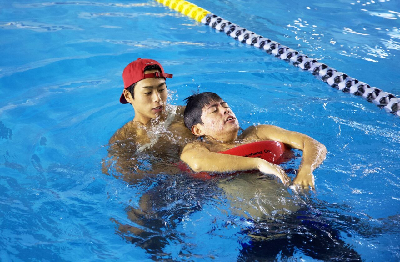 <人の命を 守りたい人、 待 っ てます> 部員の半数以上は水泳未 経験者ですが、「海水浴場 の事故を防ぎたい」という 思いで泳力と走力を鍛え て い ま す。監 視 活 動 前 に は、海水浴場を想定して救 助のシミュレーションを実 施。試合に向けた練習にも 励んでいます。
