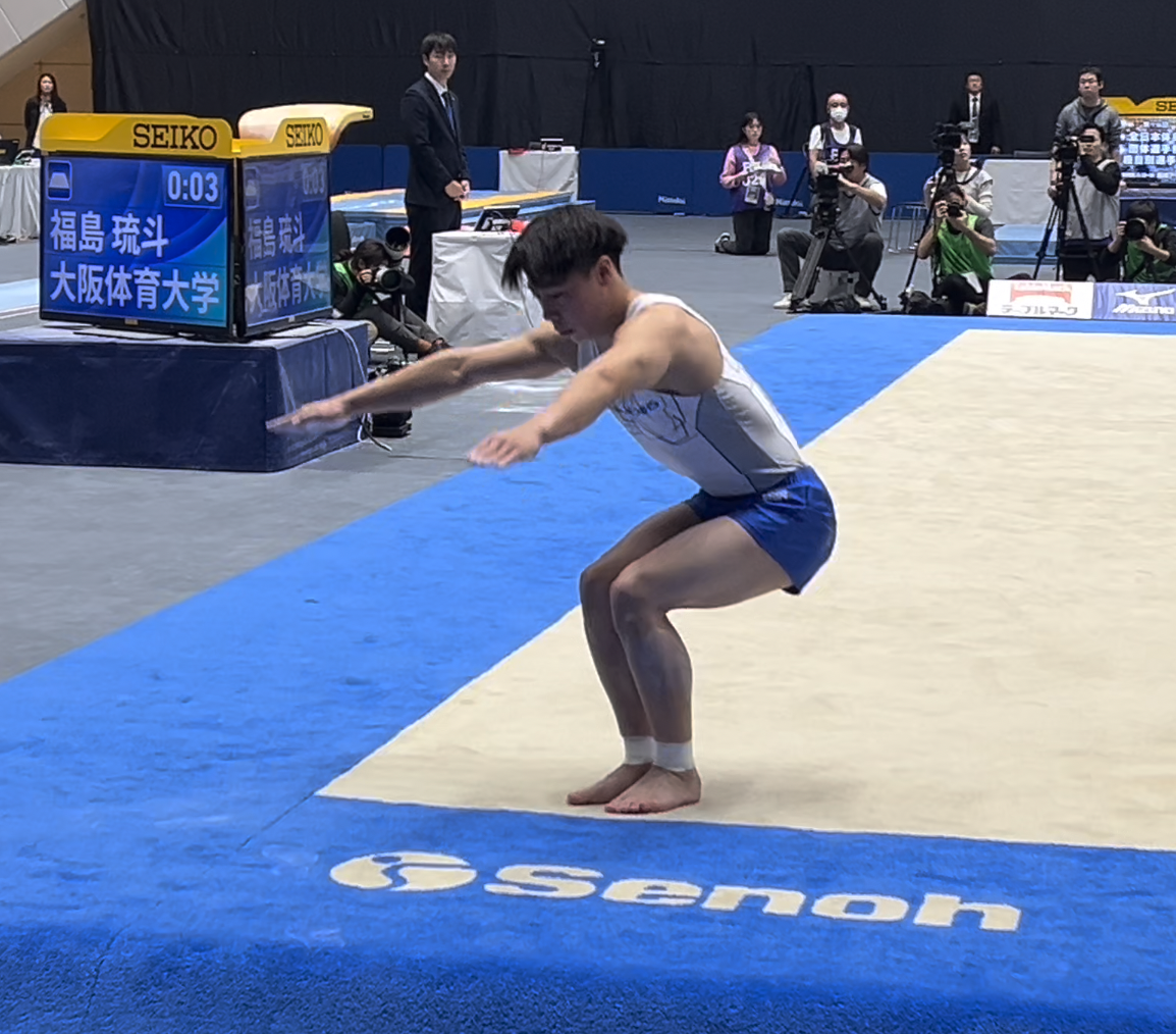 2025年11月16日、群馬県高崎アリーナで開催された第79回全日本体操種目別選手権決勝において、種目別ゆかで 福島琉斗(スポーツ科1年・大体大浪商高校)が見事な演技を披露し、銅メダルを獲得しました。本学男子体操競技部員が全日本選手権で表彰台にのるのは、武井尚樹さん(1994年種目別あん馬2位)以来、史上2人目の快挙となります。種目別跳馬において、同じく決勝に駒を進めた山﨑海音(スポーツ科1年・出水商業高校)は8位入賞となりました。