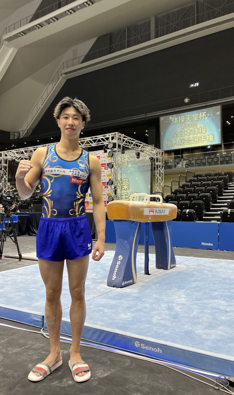 4月19日(日)に行われた第80回全日本体操個人総合選手権の決勝において、築山翔馬選手(2026卒、現:東体操スクール/浪商学園大体大クラブ)は全種目において素晴らしい演技を披露し、2日間の合計で8位入賞となりました。特に、「ゆか」種目においては、全出場選手中で最高得点を記録しました。(公式結果→日本体操協会HP)