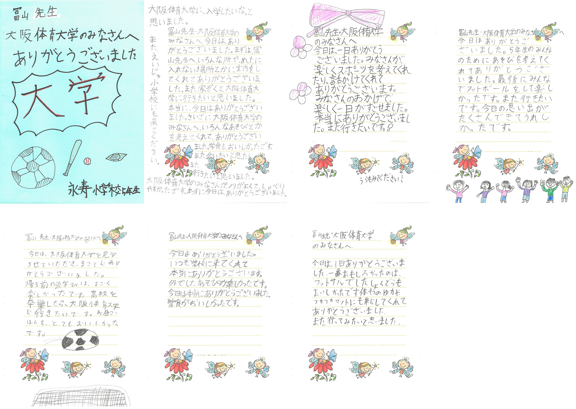 後日、児童1人1人からお礼の手紙が届きました。「体操のふかふかマットに乗れてよかった」「大学のみなさんのノリがよく楽しかった」「フットサルが面白かった」「学食がおいしかった」「大阪体育大学に入学したいなと思いました」などとつづられていました。