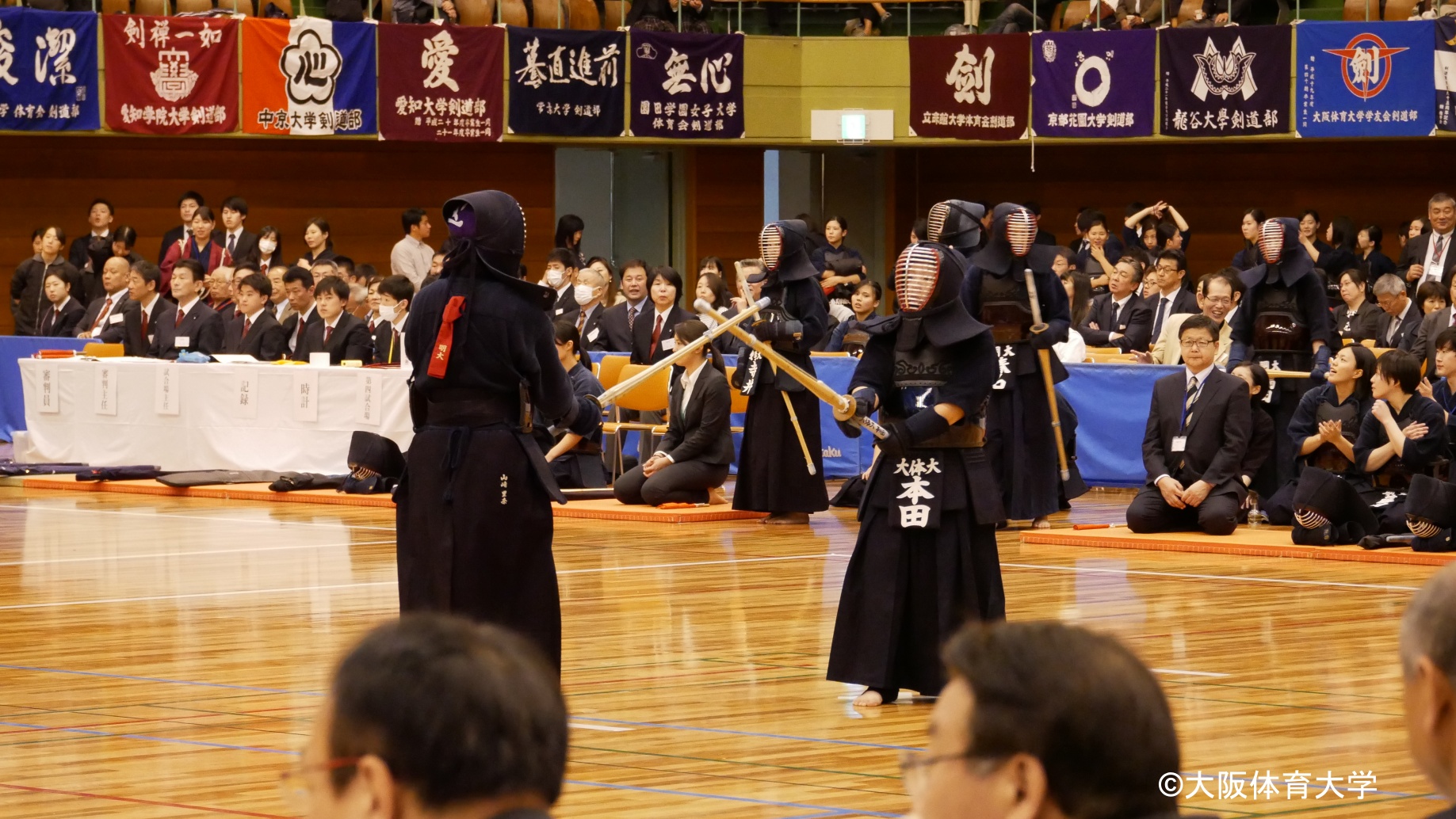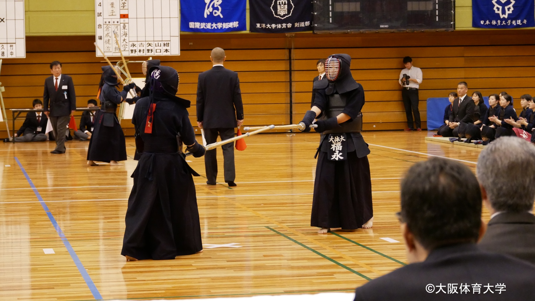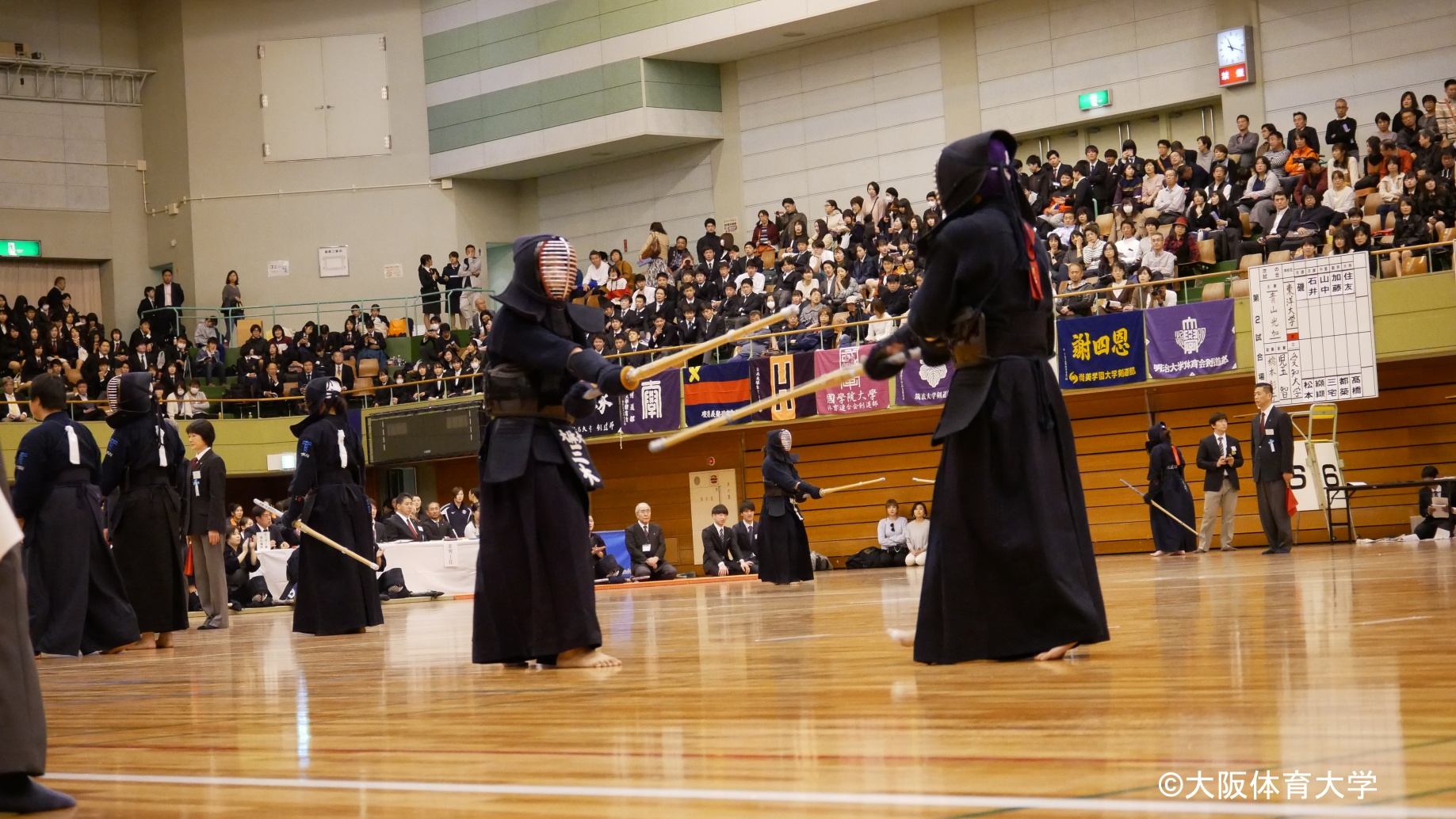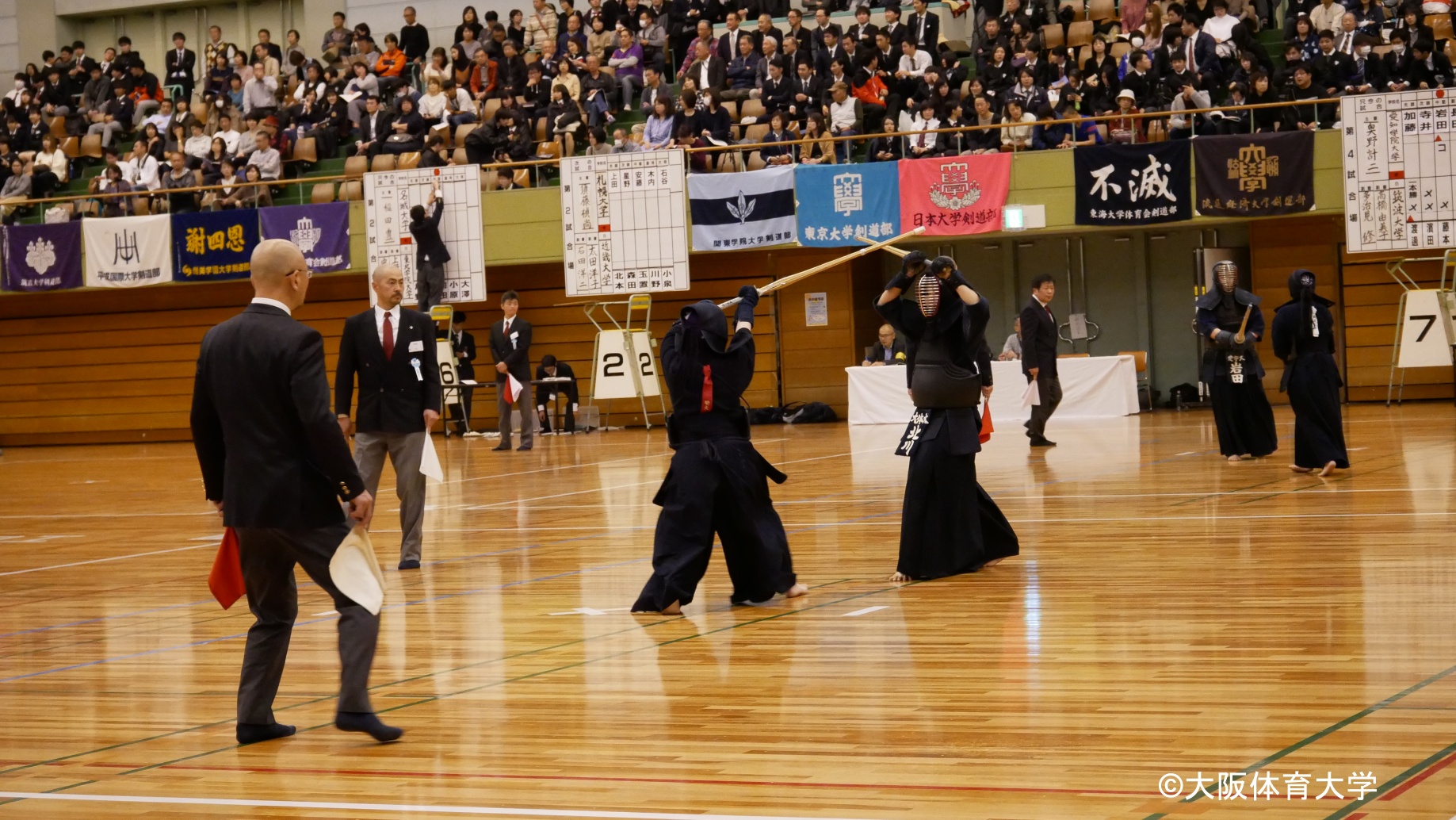 大阪体育大学は、先鋒の本田和(のどか)(体育学部2年)が、先述したインカレ2位の山崎選手と対戦、一進一退の攻防でお互い一本ずつを取得し、引き分け。つづく次鋒戦は、三木あずみ(体育学部4年)が、面を先制し一本勝ち。中堅戦は岡田麻耶(体育学部4年)が善戦するも、一本負け、副将戦は、先の個人戦優勝者で、2018年の第17回世界剣道選手権大会(韓国)メンバーである小松加奈選手に、上段の北川真優(体育学部2年)が善戦、引き分けで、勝利者数1対1のまま、大将戦に持ち込んだ結果、一回戦から会場注目の大一番となった。大将戦は、福永らら(体育学部2年)が、2018年全日本女子学生剣道選手権優勝者である藤﨑薫子に粘りの試合をみせ、引き分けに持ち込み、勝負は、代表者戦にまでもつれることになった。