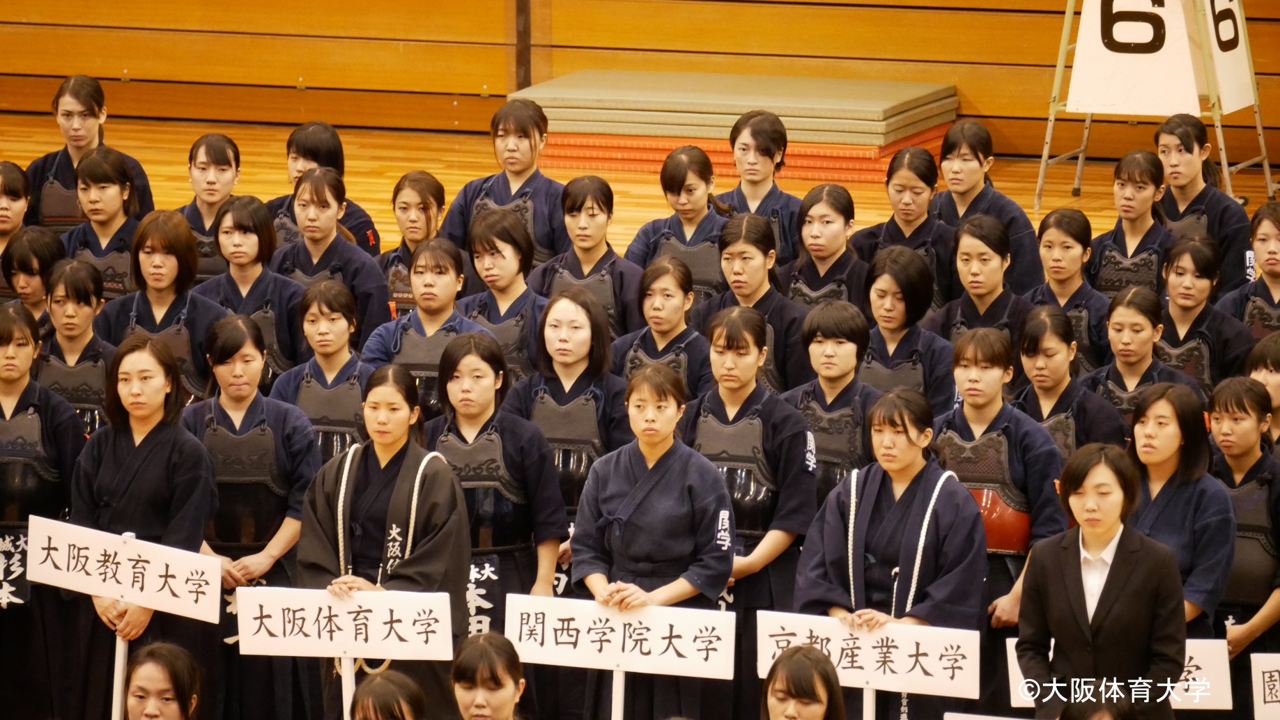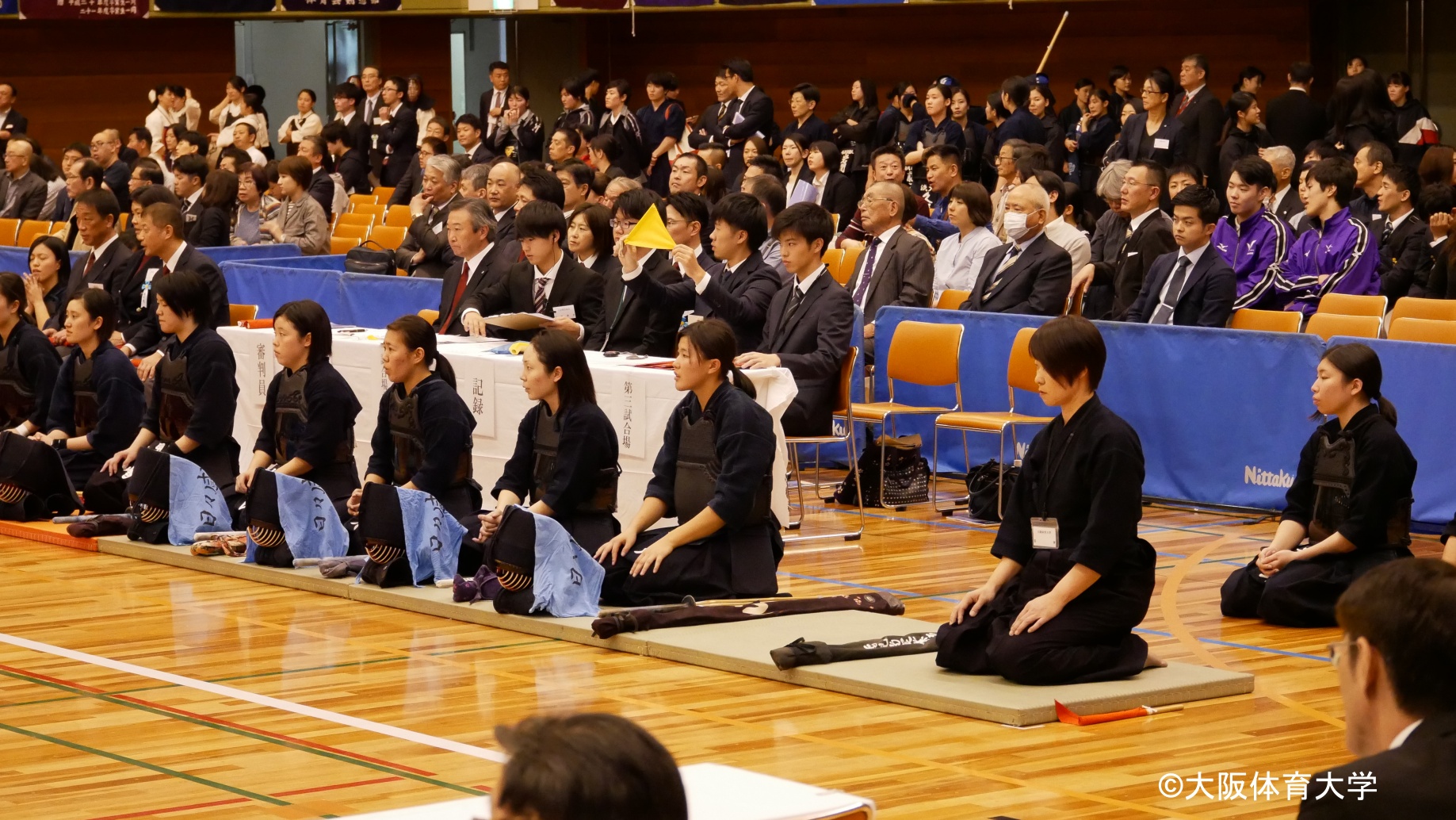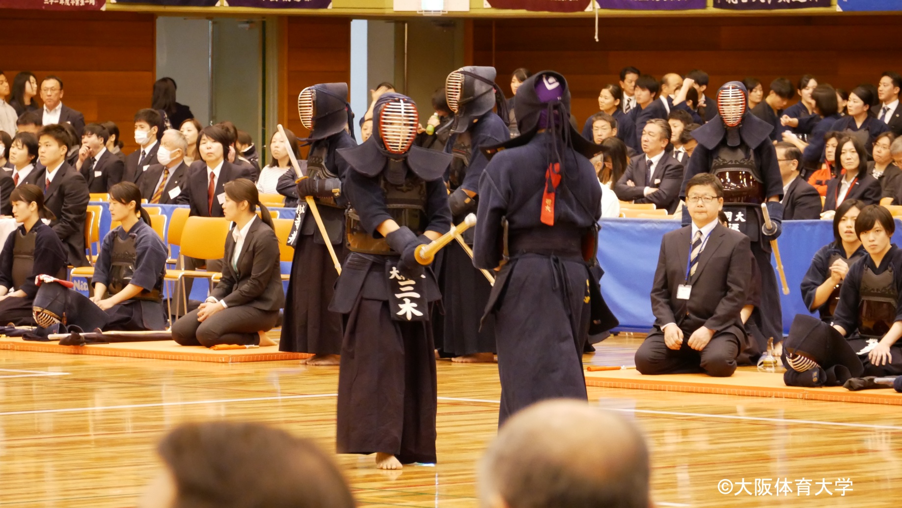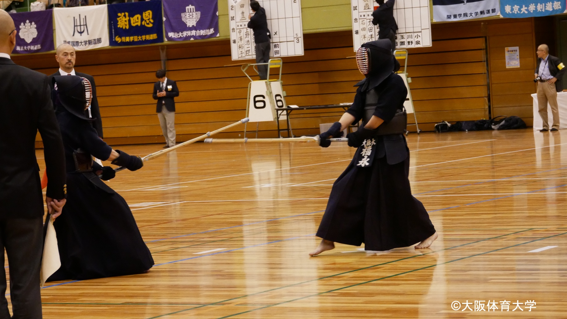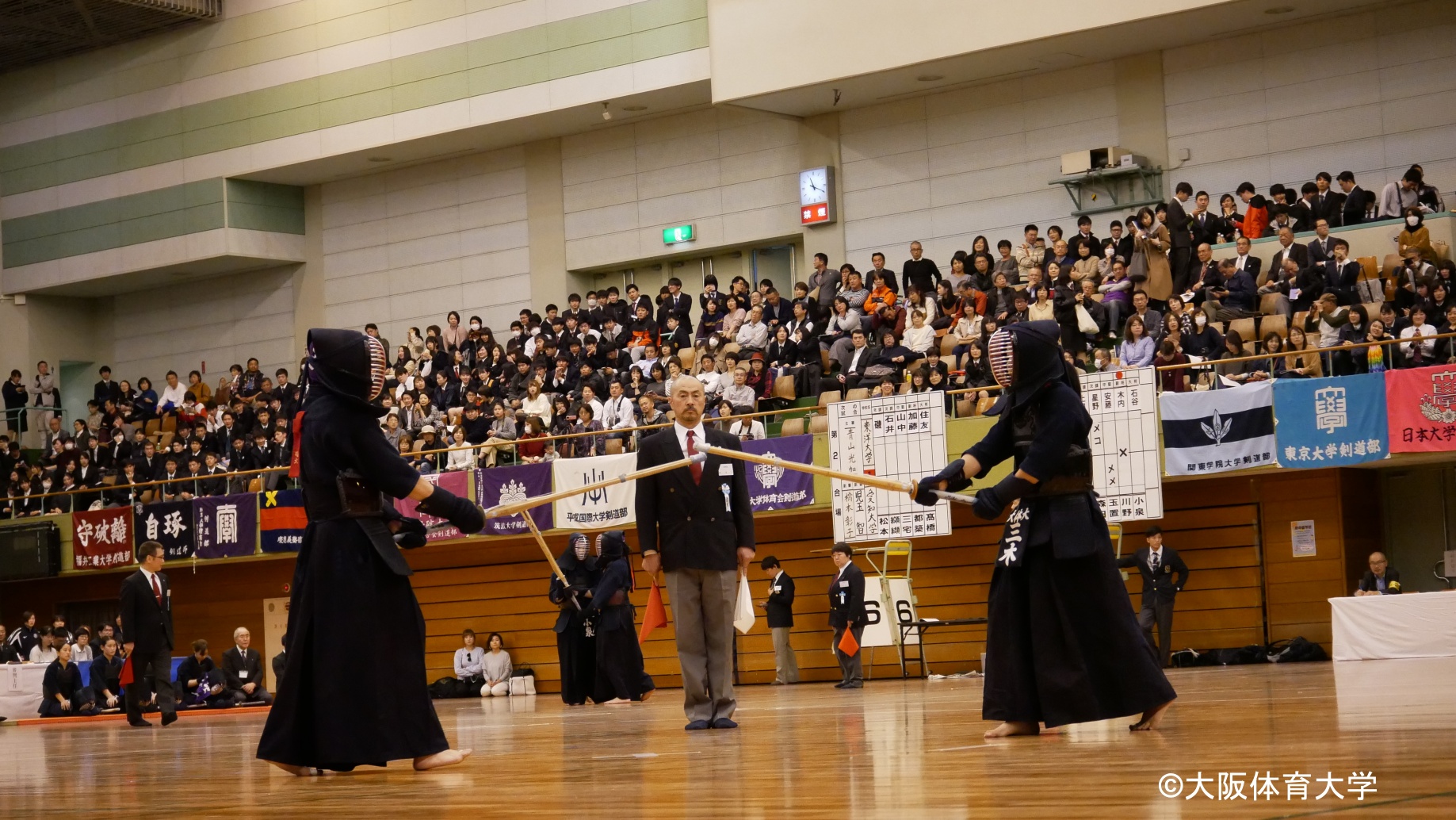 大阪体育大学は、先鋒の本田和(のどか)(体育学部2年)が、先述したインカレ2位の山崎選手と対戦、一進一退の攻防でお互い一本ずつを取得し、引き分け。つづく次鋒戦は、三木あずみ(体育学部4年)が、面を先制し一本勝ち。中堅戦は岡田麻耶(体育学部4年)が善戦するも、一本負け、副将戦は、先の個人戦優勝者で、2018年の第17回世界剣道選手権大会(韓国)メンバーである小松加奈選手に、上段の北川真優(体育学部2年)が善戦、引き分けで、勝利者数1対1のまま、大将戦に持ち込んだ結果、一回戦から会場注目の大一番となった。大将戦は、福永らら(体育学部2年)が、2018年全日本女子学生剣道選手権優勝者である藤﨑薫子に粘りの試合をみせ、引き分けに持ち込み、勝負は、代表者戦にまでもつれることになった。