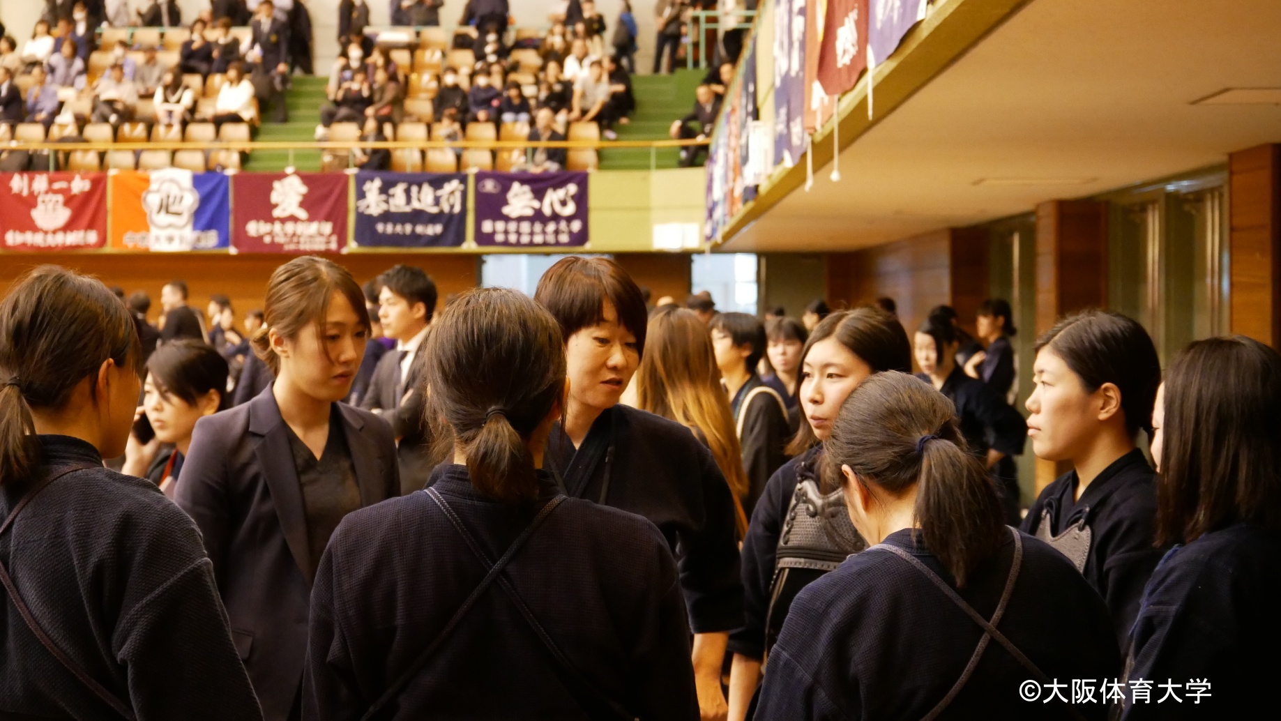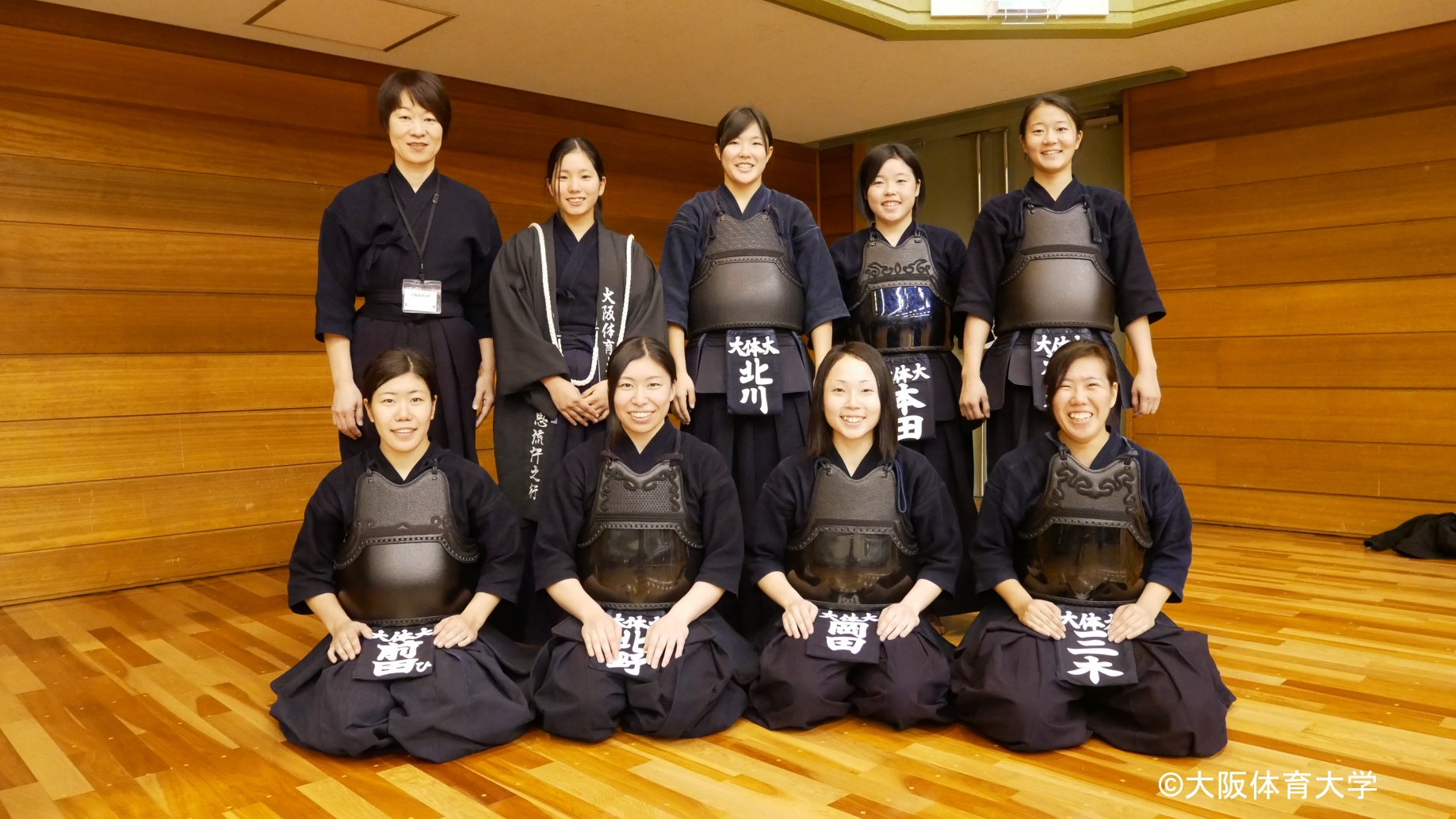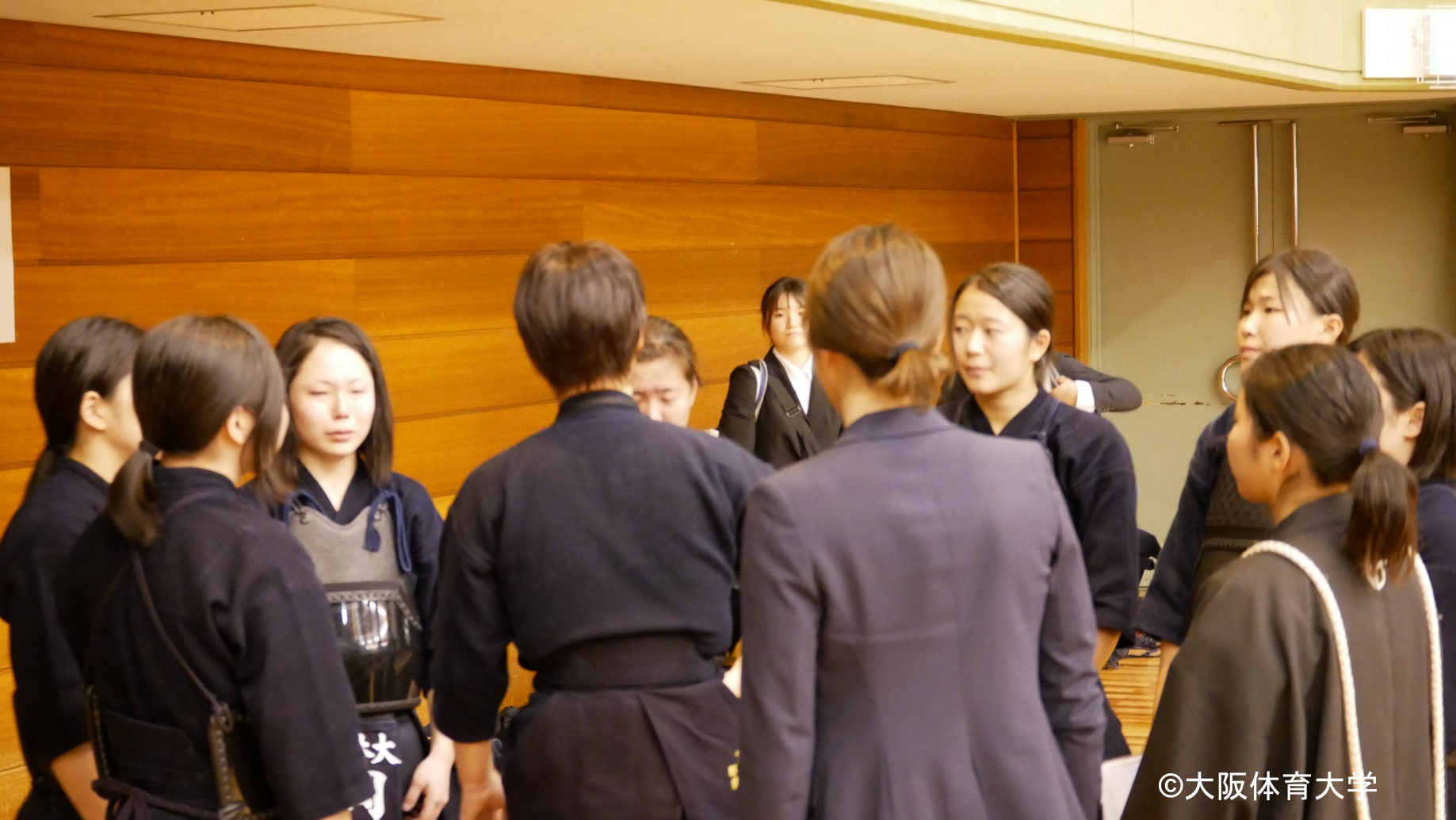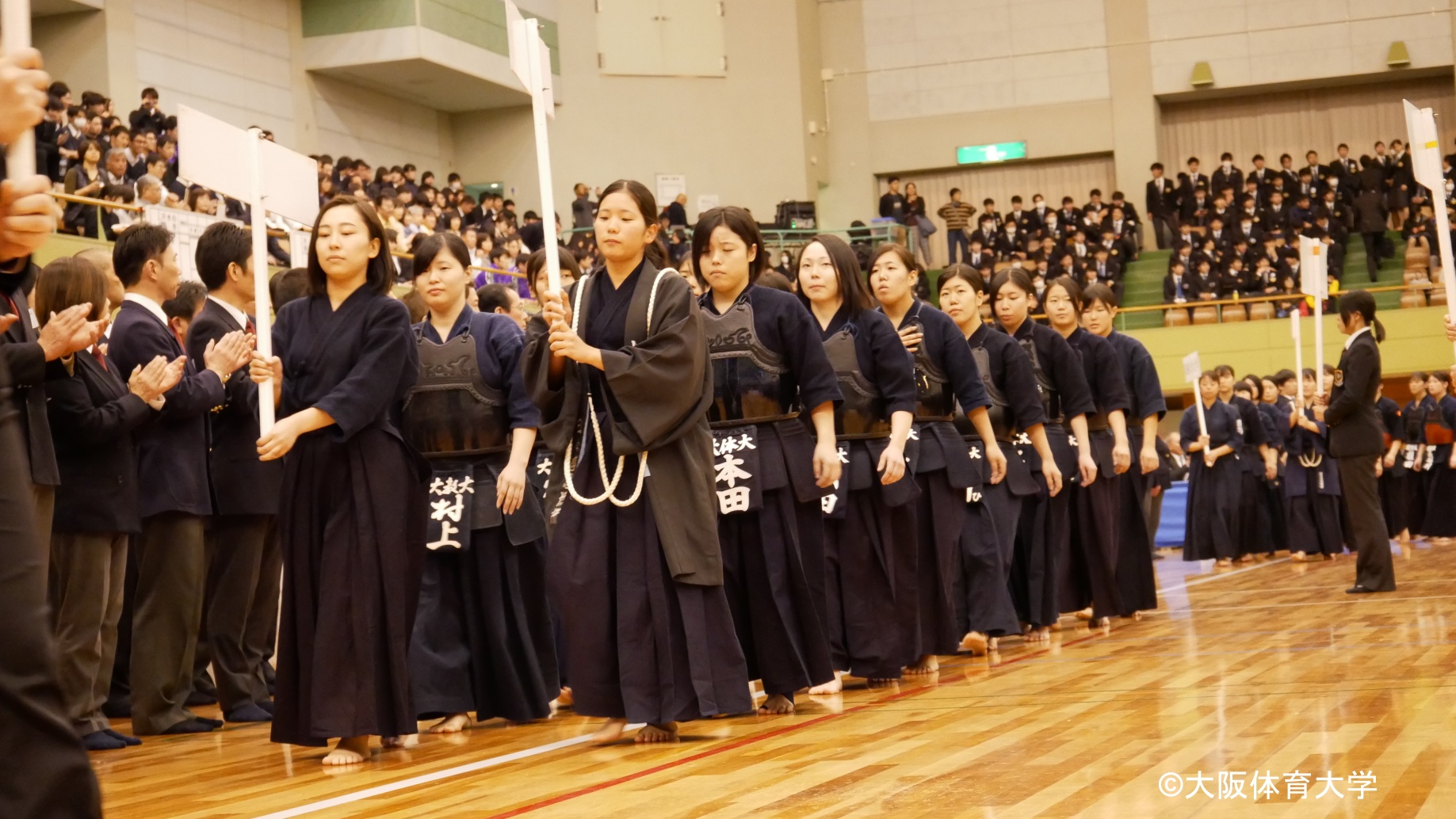 大阪体育大学は、先鋒の本田和(のどか)(体育学部2年)が、先述したインカレ2位の山崎選手と対戦、一進一退の攻防でお互い一本ずつを取得し、引き分け。つづく次鋒戦は、三木あずみ(体育学部4年)が、面を先制し一本勝ち。中堅戦は岡田麻耶(体育学部4年)が善戦するも、一本負け、副将戦は、先の個人戦優勝者で、2018年の第17回世界剣道選手権大会(韓国)メンバーである小松加奈選手に、上段の北川真優(体育学部2年)が善戦、引き分けで、勝利者数1対1のまま、大将戦に持ち込んだ結果、一回戦から会場注目の大一番となった。大将戦は、福永らら(体育学部2年)が、2018年全日本女子学生剣道選手権優勝者である藤﨑薫子に粘りの試合をみせ、引き分けに持ち込み、勝負は、代表者戦にまでもつれることになった。