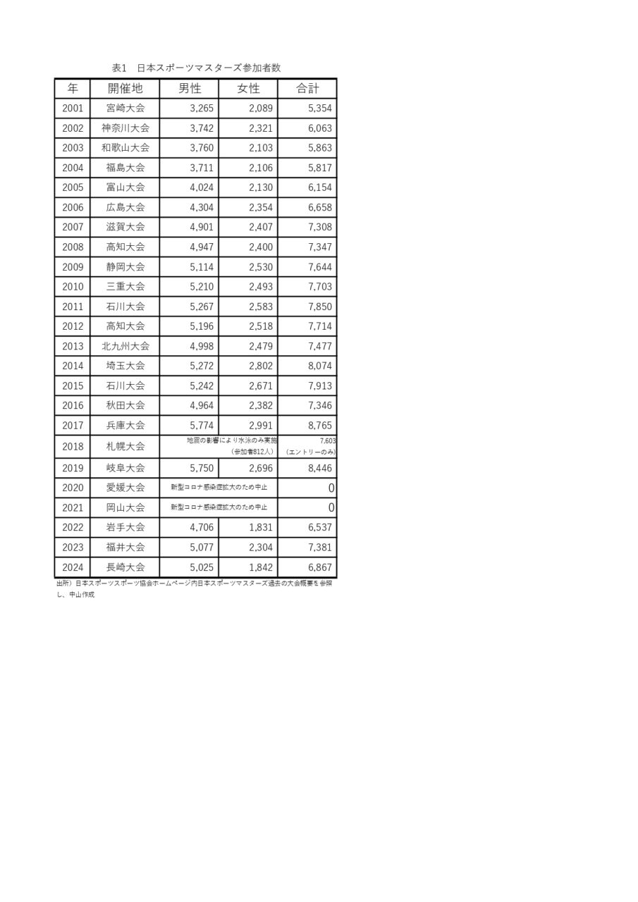 日本国内では、公益財団法人日本スポーツ協会が主催する総合スポーツ大会として『日本スポーツマスターズ』(原則35歳以上であるが、競技毎に出場可能年齢が定められている)が2001年に宮崎県で開催されて以来、競技志向の高いシニア世代のスポーツ愛好者の受け皿として四半世紀に迫る歴史を刻んできました。この大会には40歳台から50歳台の参加者の多いことが報告されています。競技種目数は、2001年宮崎大会の12種目からはじまり、競技種目の追加および入れ替えをしながら13種目で推移してきました。その参加者数は5000人台からはじまりコロナ禍前の2019年大会では8000人台まで参加者数を増やしてきました。平均では7200人弱の参加者数です。その中で男女比を比較してみると女性参加者数は平均約2400人、男性参加者の平均約4800人の約半数で推移してきました(表1参照)。