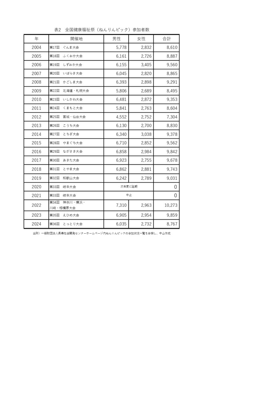 次に、60歳以上の男女が主な参加者である全国健康福祉祭を高齢者のマスターズスポーツ大会として位置づけ、その参加人数を確認してみましょう。同大会は、通称『ねんりんピック』として1988年に厚生省創立50周年を記念して開催され、現在では、厚生労働省、開催地および一般財団法人長寿社会開発センターを主催者として毎年開催されています。この大会は、高齢者の幅広い参加や楽しさに重点をおいた「スポーツ交流大会」と開催都道府県の特徴を取り入れた「ふれあいスポーツ交流大会」を中心として実施されています。また、世代間交流事業なども行われるなど、幅広く参加者を集めてきました。ここでは、「スポーツ交流大会」と「ふれあいスポーツ交流大会」の参加者数を男女別で確認できる2004年大会まで遡り確認してみます。競技種目は開催地によって異なるものの25種目前後で推移してきました。このことからもマスターズスポーツ実践者の交流の場として同大会が継続的に開催されている意義は大きいといえます。平均すると約9200人の参加者数であり、おおむねその3割が女性参加者でした(表2参照)。